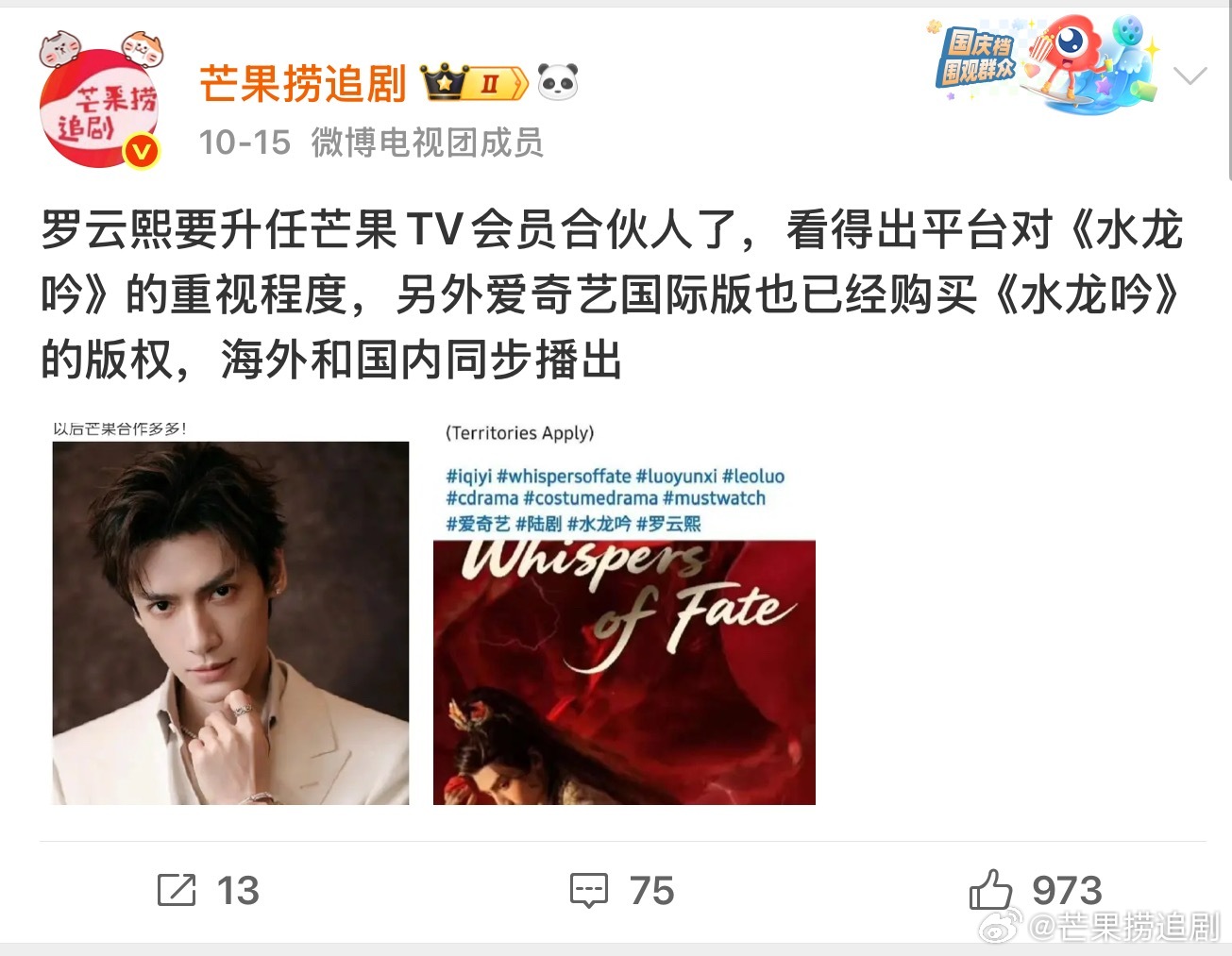 恭喜罗云熙成为首位芒果TV会员合伙人,坐等《水龙吟》明天上线,虽然早就知道但还是