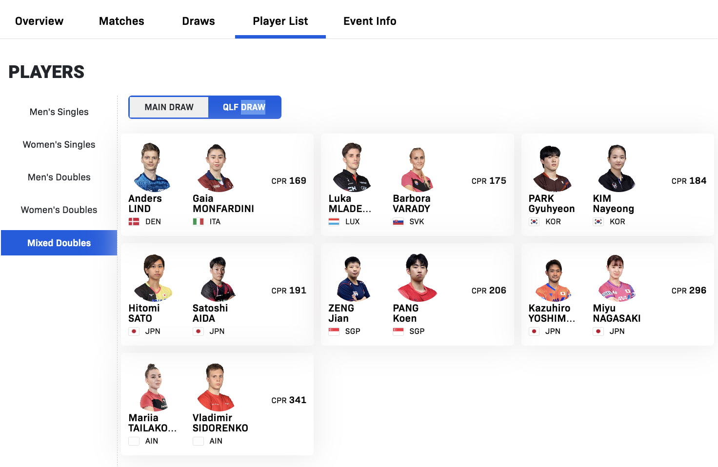 罗伯勒斯/肖瑶茜🇪🇸、玛纳什·沙/奇塔莱🇮🇳、林昀儒/郑怡静(中国台北)、卡尔森/C·卡尔伯格🇸🇪、斯佐科斯/E·约内斯库🇷🇴、阿齐兹/阿尔霍达比🇪🇬、帕尔/拜西亚🇮🇳、赵大成/朱芊曦🇰🇷