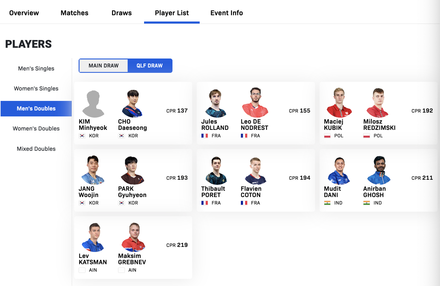 赵大成/金敏赫🇰🇷、罗兰/诺德雷斯特🇫🇷、库比克/雷德齐姆斯基🇵🇱、张禹珍/朴奎炫🇰🇷、泊雷特/科顿🇫🇷、达尼/戈什🇮🇳、卡特斯曼/格列布涅夫(AIN)