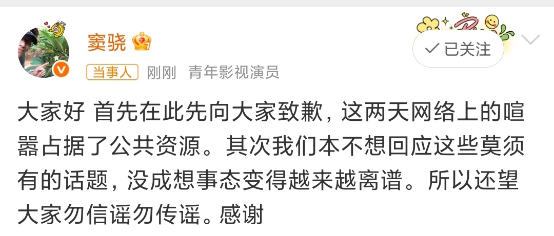 何超莲窦骁发文回应近期感情争议