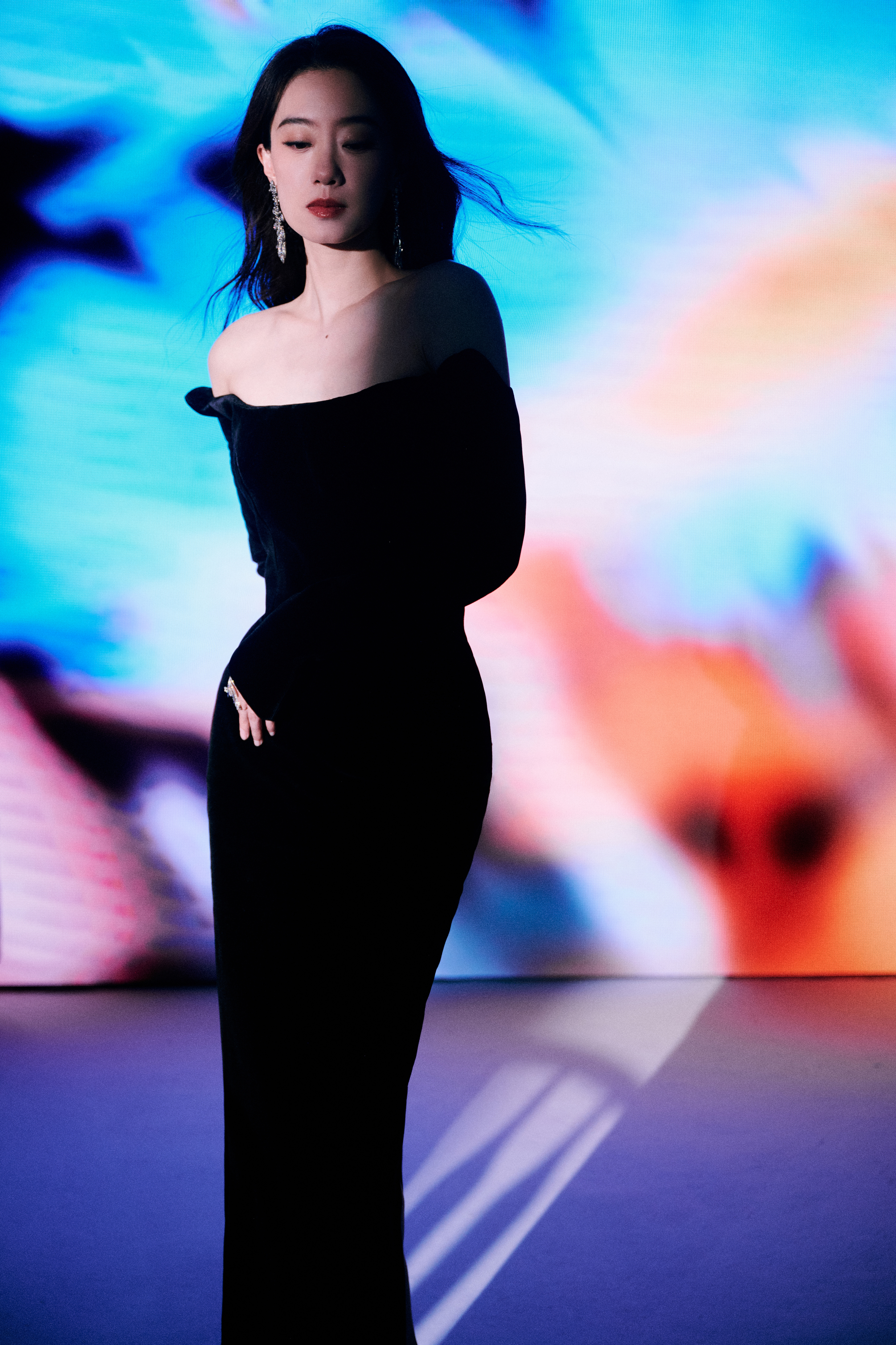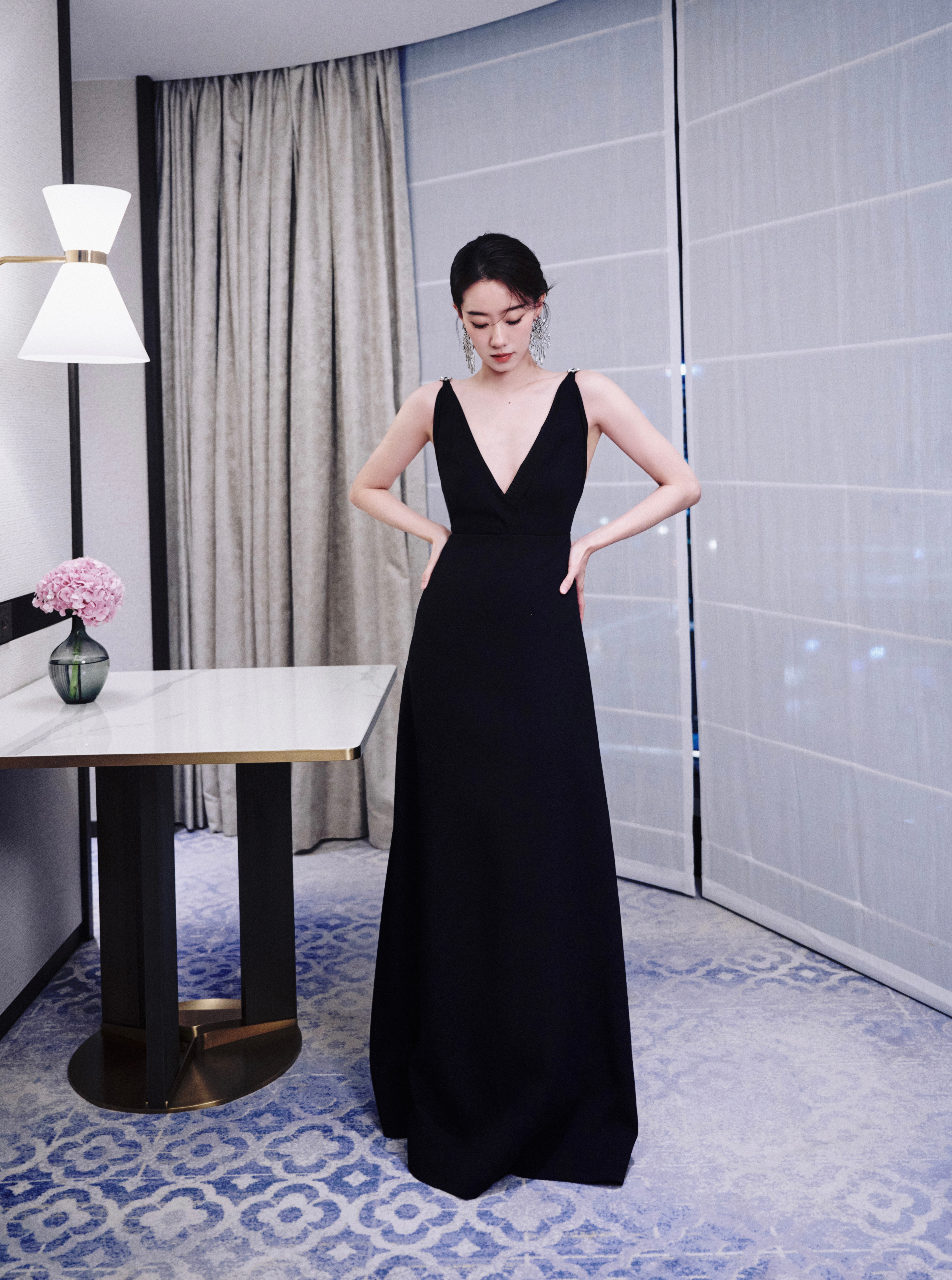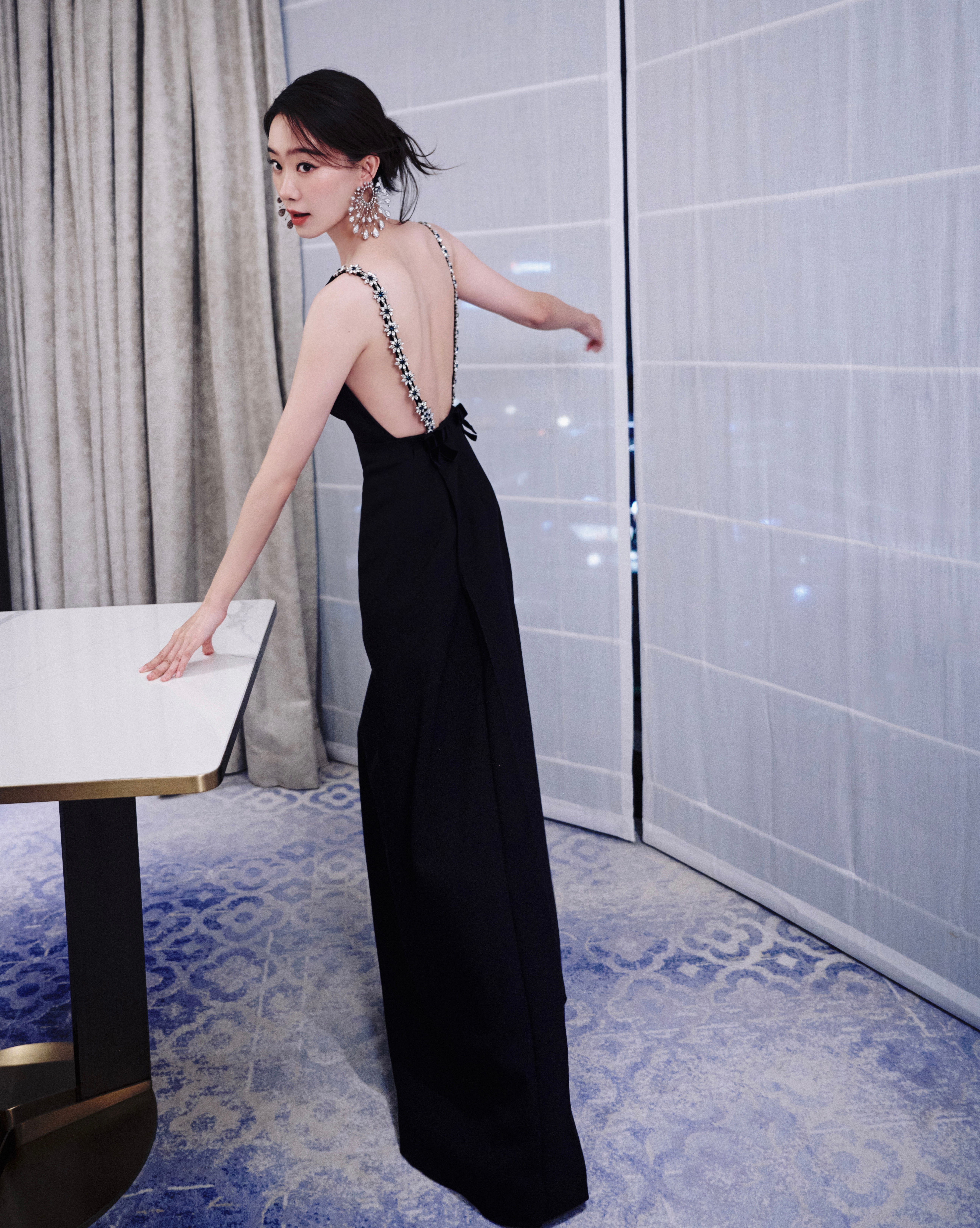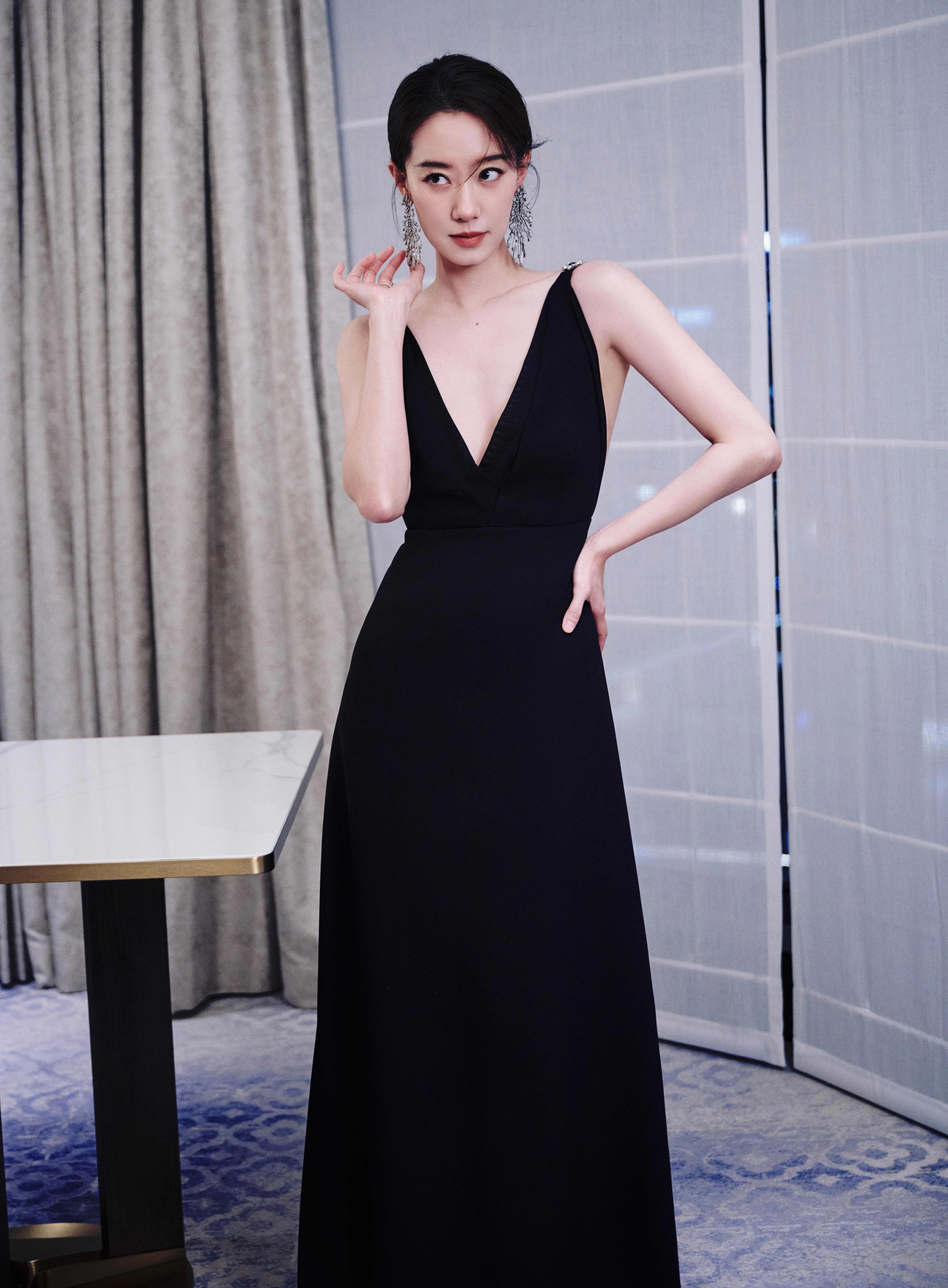 张小斐黑裙如夜裁成,缀满星光的肩带牵引着流光,转身时,后背漾开的弧度里,藏着