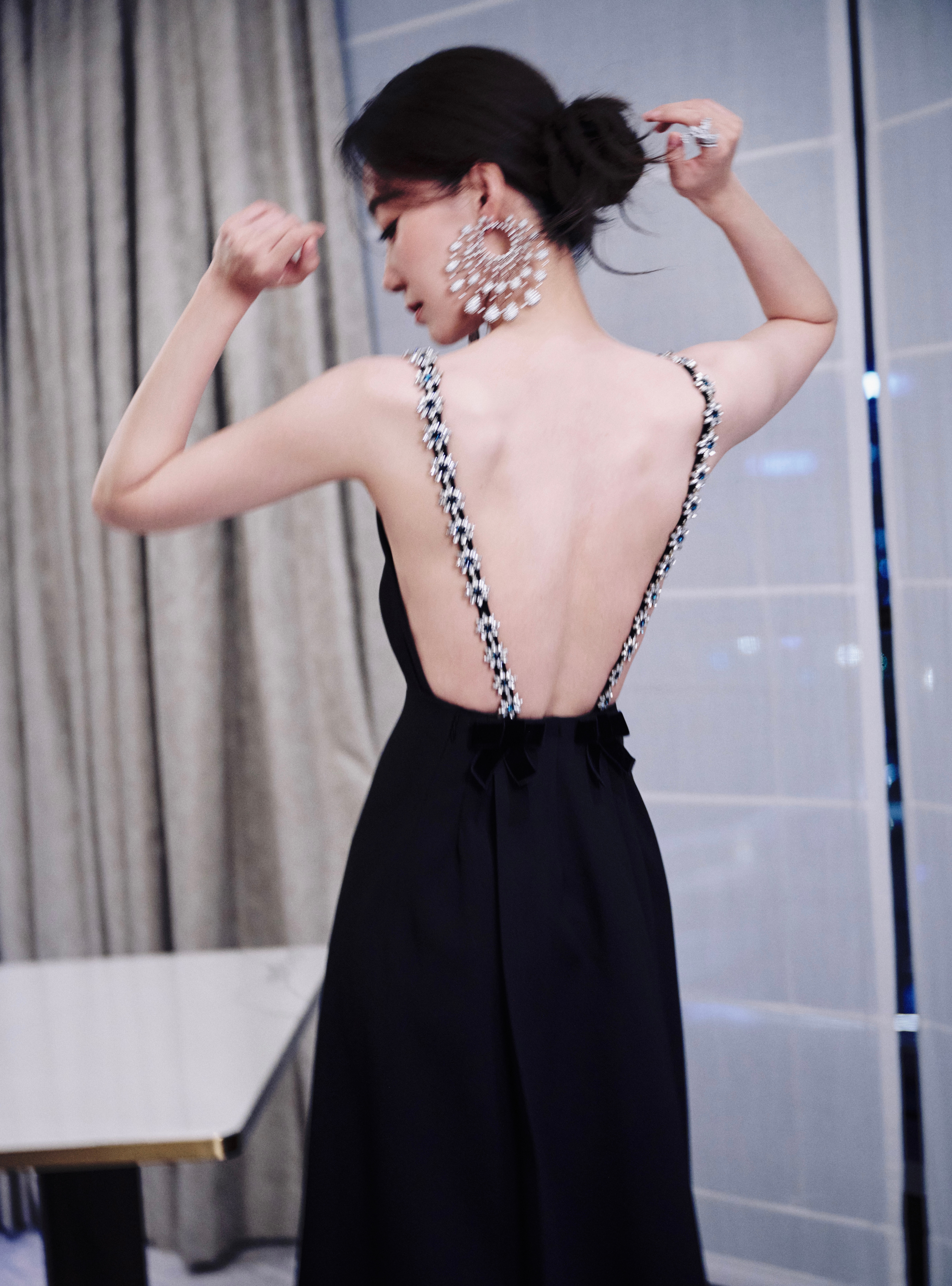 张小斐 黑裙如夜裁成,缀满星光的肩带牵引着流光,转身时,后背漾开的弧度里,藏着优雅与俏皮的共生密语。杨幂张小斐 耳畔生花张小斐 短短四年气定神闲