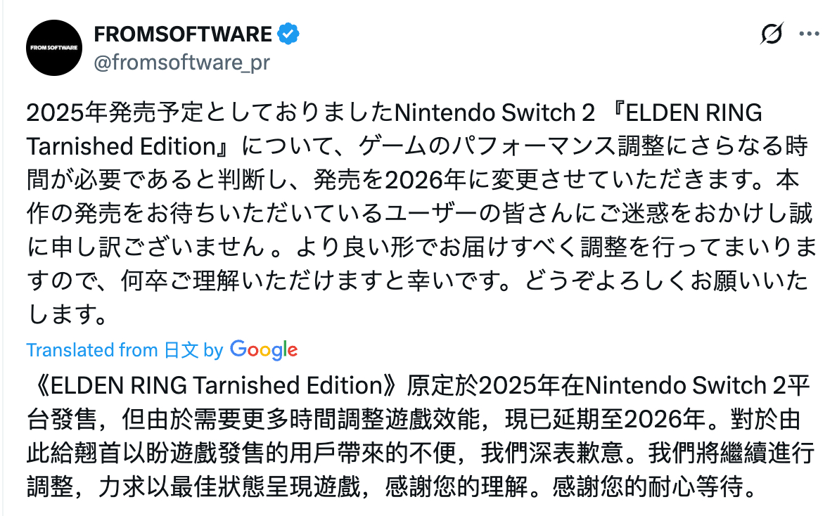 开发商FROMSOFTWARE宣布,原定于2025年发售,登陆Switch 2的《艾尔登法环 褪色者版》延期至2026年。原因是需要更多的时间调整游戏的性能,并对等待该作的玩家们表示歉意。艾尔登法环