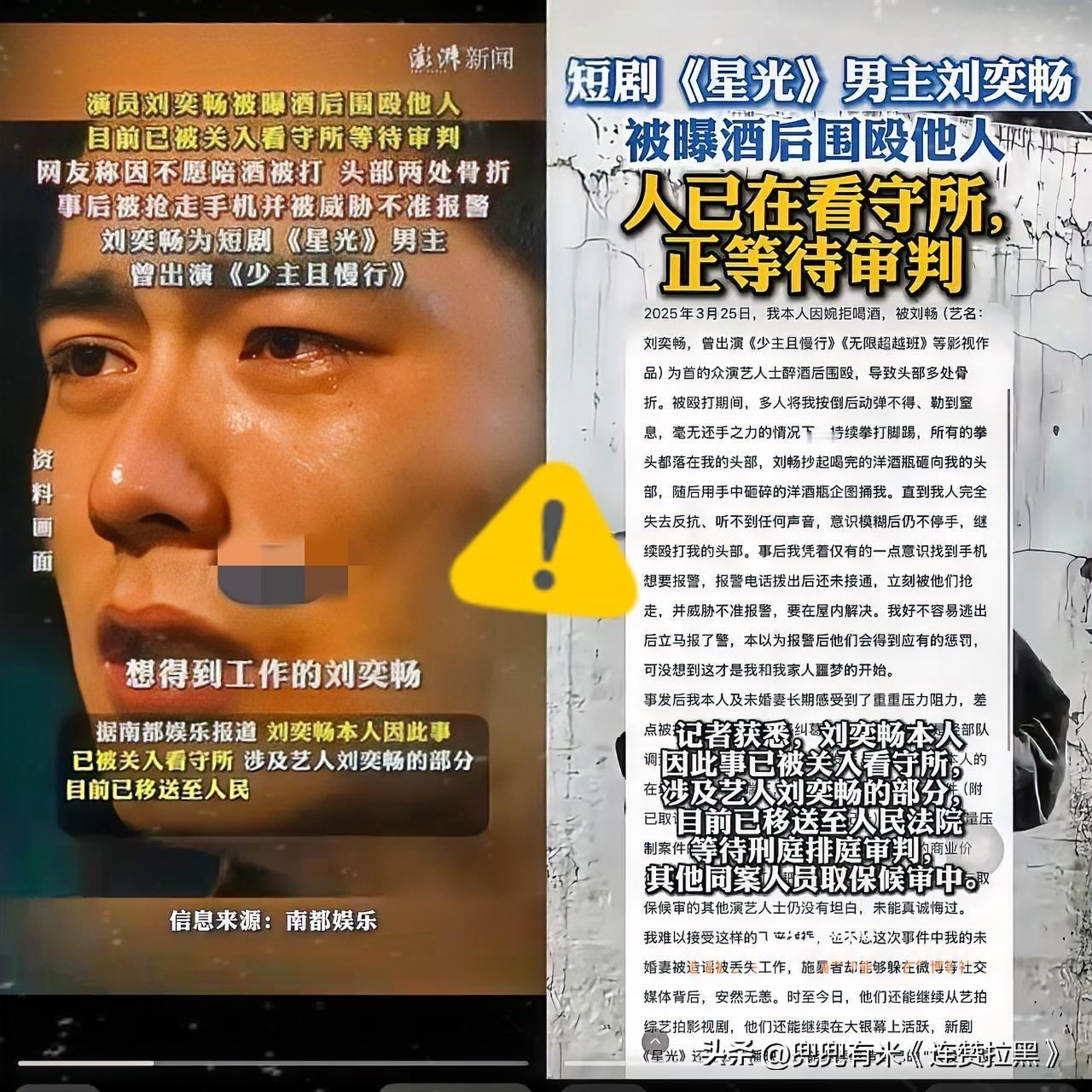 真没想到刘奕畅这事儿深挖下去 比他动手打人还让人恶心! 一群人围殴军人梁先生致骨折 事后不仅不认错还威胁受害者闭嘴 现在刘奕畅和同伙被刑拘纯属活该 但他女友李沐宸的操作才更让人愤怒 当时就在现场的她 不拦着就算了还眼睁睁看着施暴 事后居然敢撒谎作伪证说自己全程拉架 结果被聊天记录狠狠戳穿 合着这是组团作恶还想联手掩盖? 最讽刺的是 梁先生全程不还手不是怕他们 是骨子里刻着军人的责任和底线 可这些所谓的公众人物 拿着光环却连基本的是非观都丢了 动手的该罚,帮着串供撒谎的同样不能轻饶 法律制裁是必须的 但公众更该看清这种人的真面目 别让所谓的"身份"成为他们践踏底线的挡箭牌 说到底,敬畏之心才是做人的根本 对保家卫国的军人动手 还试图用谎言掩盖恶行 这种人就该被狠狠钉在耻辱柱上 你们觉得 除了法律的严惩 对于这种毫无底线的人 公众层面该怎么让他们付出代价?徐奕 刘奕奕 刘桐畅 刘鸣畅 刘耀奕 刘奕希 张艺畅