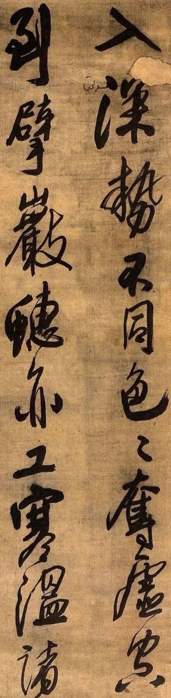 明清·王铎自署书于戊子年(清顺治五年,1648年)行草书立轴,绫本。凡四行,共四十九字。纵169厘米,横50.5厘米。现为济南市博物馆藏。 释文:“入深势不同,色色夺虚空。汲路鸦能到,擘岩蟪亦工。寒温诸药气,薄厚一钟风。如赐栖身地,贴心住石丛。戊子三月,书北畿,王铎。” 王铎《入深势不同》属其晚年(时年56岁)成熟行草风格。 核心为“涨墨连绵、气脉贯通”。 用笔力沉,提按顿挫张力足,涨墨与枯笔对比强烈; 结字欹侧险绝,破平稳求奇崛; 章法字密行疏,字群连绵如“一笔书”,奔涌豪迈。 融颜真卿厚重、米芾跳宕,凝雄强气度,是其“狂草典范”的浓缩呈现。 明·天启二年(1622年),王铎登进士第,与黄道周、倪元璐结契研书,并称“三狂人”(亦作“三株树”)。得考官袁可立赏识提拔,他入翰林院任庶吉士,后逐步升至礼部尚书。 崇祯十六年(1643年),擢东阁大学士。1644年清军入关,王铎随钱谦益率群臣迎降,此后仕清,任礼部尚书、弘文院学士,加太子少保,沦为“贰臣”。相较于倪、黄二人殉国守节,他的降清之举成一生“失节”污点。据钱谦益所撰墓志铭,王铎降清后终日颓唐,以书画、饮酒排遣失意。 顺治九年(1652年),降清九载的他病逝故乡孟津,年六十一,葬于河南巩义洛河畔,获谥“文安”。