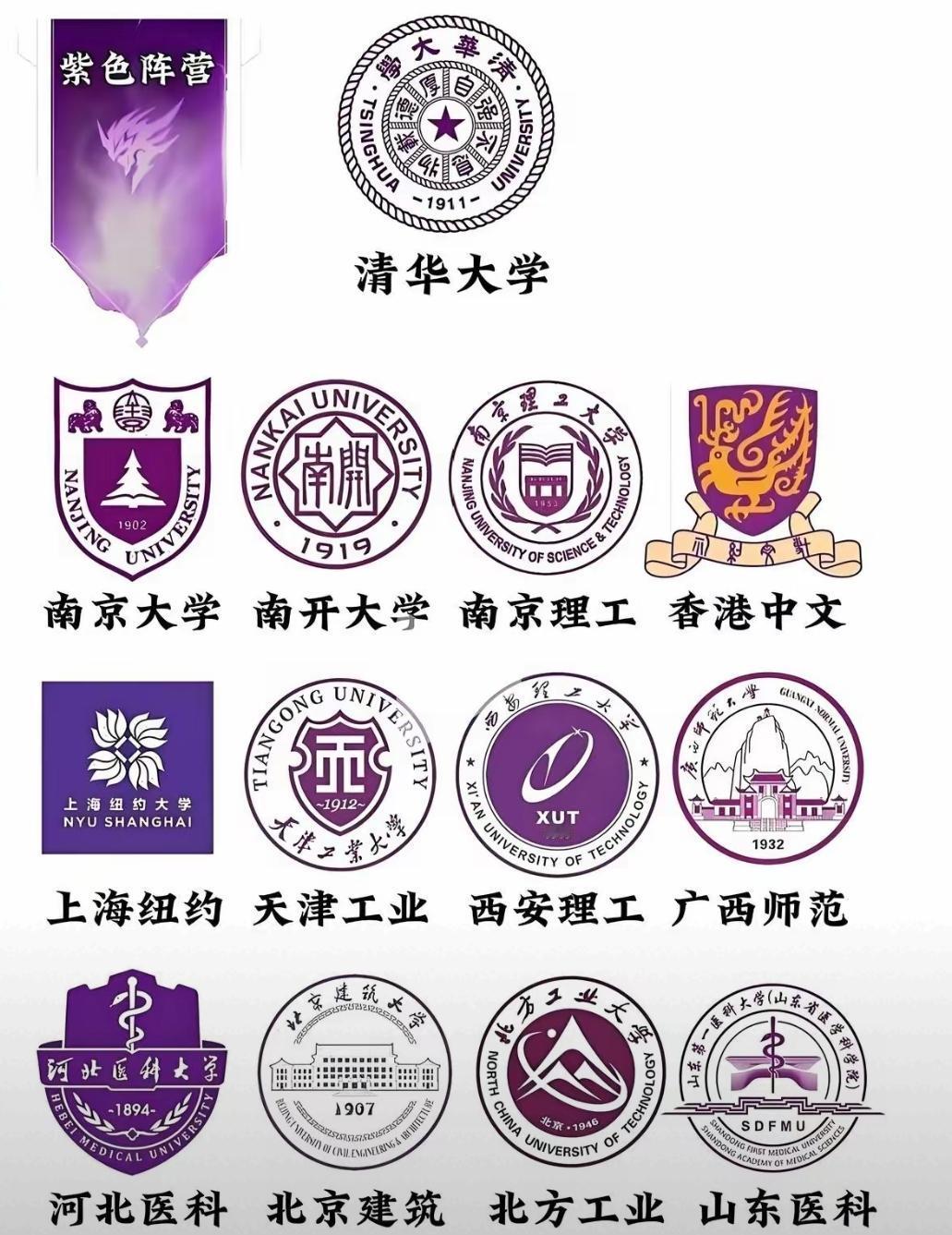 当高校校徽染上“紫”,这股浪漫里藏着多少青春底色? 打开这张图的时候,忽然被满屏的紫撞了眼——不是那种晃眼的艳,是像浸了墨的绢,裹着不同学校的气质,安安静静又热热闹闹地聚在一起。 最先看见的是清华的校徽,紫底衬着“自强不息,厚德载物”的校训,1911的数字像枚印章,把百年的书香气摁在了这抹紫里。记得以前逛清华园,春天的紫藤萝爬满老墙,风一吹就落得肩头都是紫,那时候总觉得这颜色和学校很像:既有老建筑的沉,又有少年人的亮。 旁边南大的校徽是深紫的盾形,雪松立在中间,1902的年份藏在下面。想起南大的鼓楼校区,秋天的梧桐叶落满紫叶李的树下,紫和黄裹着图书馆的窗,连自习室的灯光都像是滤了层紫纱。南开的校徽更圆一些,“南开”两个字写得舒展,1919的刻度里,好像能听见当年学子的读书声,裹在津城的风里,也是紫的。 还有南京理工的校徽,紫圈绕着书本与建筑,港中文的凤凰踩着紫底,连上海纽约大学的校徽都用了浅紫,像把外滩的晨雾揉了进去。天津工业、西安理工、广西师范……不同的紫,有的浓得像陈酿,有的淡得像云絮,却都裹着各自的故事:是某个清晨抢图书馆座位时撞见的紫花,是毕业季学士服上别着的紫徽,是离开校园后再看见同色时,忽然漫上来的青春气。 其实紫从来不是单一的色。河北医科的校徽上,紫底衬着蛇杖,像把白大褂的干净裹进了温柔里;北京建筑的校徽里,紫线勾着老楼,像是把钢筋水泥的硬,揉成了建筑美学的软;北方工业的校徽用紫描了几何形,带着工科生的利落;山东医科的紫,又裹着医学院的严谨。 这些紫凑在一起的时候,忽然觉得“阵营”两个字很可爱——不是什么分明的界限,是一群带着各自青春印记的人,因为同一种颜色,忽然有了隐秘的联结。就像你走在路上,看见有人背着印着紫徽的包,哪怕不认识,也会忽然想起:哦,那是和我母校同色的地方,那里也有一群人,正把青春铺在这抹紫里。 我们总说校徽是学校的脸,可这抹紫更像学校的“气质色”。它不是标签,是藏在岁月里的共鸣:或许是某个晚自习后,路灯把影子拉得很长,紫叶李的花瓣落在笔记本上;或许是毕业答辩那天,穿了件淡紫的衬衫,紧张时指尖捏着的校徽也是紫的;或许是多年后回校,看见新生校服上的紫,忽然想起自己当年也穿着同款,站在同一块校碑前拍照。 这些紫,裹着不同的校园,不同的青春,却又在某一刻汇成同一种情绪:是提起母校时,忽然软下来的语气,是看见同色校徽时,下意识的驻足,是那些被书本、课堂、蝉鸣填满的日子,最后都凝在了这抹紫里。 你记忆里的母校,是什么颜色的?是像这样的紫,还是另一种藏着青春的色调?高校名称 黄色校徽 大学校徽 老校徽 大学校庆标识 高校校名 校庆logo