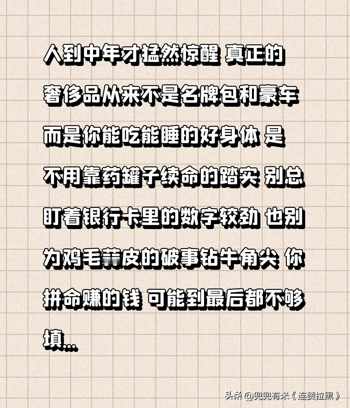 人到中年才猛然惊醒 真正的奢侈品从来不是名牌包和豪车 而是你能吃能睡的好身体 是不用靠药罐子续命的踏实 别总盯着银行卡里的数字较劲 也别为鸡毛蒜皮的破事钻牛角尖 你拼命赚的钱 可能到最后都不够填医院的账单 那些你争得面红耳赤的面子 在病痛面前连纸都不如 仔细想想 这一辈子啥是你的? 伴侣会走,孩子会长大 钱和地位更是带不走的云烟 唯一能攥在手里的 只有当下每一次顺畅的呼吸 只有每天醒来能笑着睁开眼的活力 所以啊,中年以后别瞎折腾了 把取悦别人的精力收回来 好好吃饭,早点睡觉 别跟自己的身体硬碰硬 你对它的每一份敷衍 迟早都会变成后来的麻烦 你们说,人到中年 是不是把健康攥紧了 才算真的赢了? 人生值钱清单 奢侈品 中年不脆弱