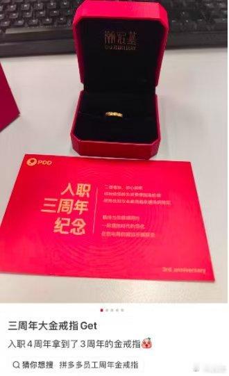 拼多多给力,今年是拼多多成立十周年,近日,入职满3年以上的员工收到公司发放的金戒指,重量在4g左右;入职满5年的员工,会发放11g的金戒指;入职满10年的员工则是重量为100g的“金鸡”。