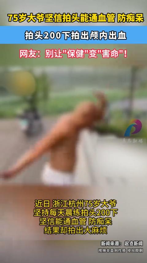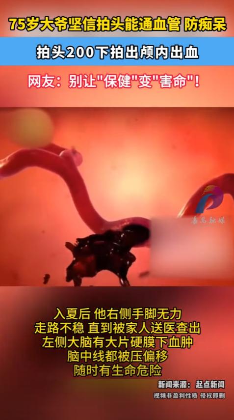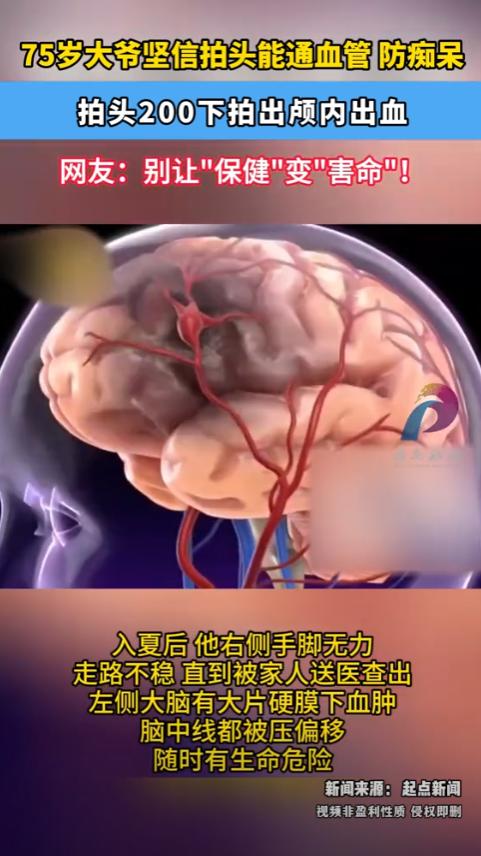 “悲剧还是发生了!”浙江杭州,一75岁大爷为了通血管、防痴呆,每天坚持拍头200下,结果坚持一一段时间后,大爷右侧手脚突然使不上力,走路一瘸一拐的,送去医院检查,被诊断为颅内出血!网友:这又是听信了谁的胡话? 杭州的叶大爷今年75了,街坊邻里都说他是个特别会保养的人,这可不是恭维话,老爷子身体硬朗得很,作息规律,不沾烟酒,每天还坚持晨练,在同龄人里绝对算得上是佼佼者。 可谁能想到,这么一位注重健康的模范,没栽在什么老年常见病上,反倒是被自己深信不疑的一个“养生秘诀”给送进了急诊室。 这个秘诀就是:每天用手拍打头部200下,号称能疏通血管,预防老年痴呆。 叶大爷并非愚昧之人,恰恰相反,正是因为他对健康的极度渴望,才让他对这种“更上一层楼”的建议毫无抵抗力,这个法子是他从手机短视频上看来的,完美击中了他的两大焦虑。 而且这法子听起来太诱人了:不用花一分钱,更不用吃药,动动手就行,他给自己定了规矩,上午150下,下午50下,跟做功课一样认真。 每次拍完,他还真感觉神清气爽,这种积极的心理反馈,让他对这个方法的正确性愈发坚信。 然而,一场灾难正在他那看似强健的身体里悄然酝酿。 医生后来解释,老年人的身体内部,发生着我们肉眼看不到的变化,大脑会随着年岁增长而自然萎缩,就像一颗脱水的核桃,导致它和颅骨之间出现了更大的空隙。 在这个空隙里,有一些连接脑组织的细小血管,叫做“桥静脉”,它们被动地拉长,变得又细又脆,成了身体里一个极其脆弱的环节。 叶大爷每天那200下不轻不重的拍打,产生的持续震动,无异于日复一日地在撕扯这些脆弱的生命线。 终于有一天,其中一根血管不堪重负,破裂了,血液开始极其缓慢地渗出,在颅内一点一滴地聚集。医生在排除了头部外伤、高血压等所有常见原因后,才从叶大爷口中,锁定了这个令人意外的“元凶”。 身体的警报其实早就响了,只是信号太模糊,被他一次次误解了。 入夏以后,叶大爷开始觉得右侧手脚没力气,右手拿东西总是不稳,右脚走路也有些拖沓。他觉得自己是年纪大了,或者天热闹的,没当回事,后来右肩也开始持续酸痛,他又归咎于是空调吹多了。 就这样,他硬是拖了大概两个月,病情越来越重,到后来走路都东倒西歪,必须扶着墙才能走稳。他的姿势怪异到连邻居都看不下去了,和家人一起反复劝说,最后几乎是强行把他送到了医院。 脑部CT结果出来,所有人都惊呆了:慢性硬膜下血肿。左侧大脑的血肿面积巨大,已经把大脑的中线结构都压得明显偏移,情况万分危急,随时可能要命。 幸运的是,通过紧急的钻孔引流手术,积血被清除了,叶大爷术后右侧手脚的无力感也开始缓解,清醒过来的他,对自己坚持了那么久的“养生法”懊悔不已。 这件事在网上也引起了热议,有网友感慨:“‘养生’变‘伤生’,真是无知者无畏。”很多人也表示了同样的担忧,说家里的老人也沉迷于各种奇特的锻炼,比如撞树、吊脖子,怎么劝都不听。 这不禁让人反思,正如一位网友的提问:“这又是听信了谁的胡话?”在信息泛滥的今天,类似江苏淮安老人误喝曼陀罗花泡的“偏方”药酒导致中毒的悲剧时有发生。 真正的健康,源于对身体的科学认知与尊重,而不是那些违背生理常识的盲目“折腾”。医生也特别提醒,慢性硬膜下血肿的初期症状,像肢体麻木、头晕、反应迟钝,太容易和正常衰老混淆,必须引起足够的警惕。 信源:番禺融媒2025-10-23——75岁大爷坚信拍头能通血管 防痴呆拍头200下拍出颅内出血