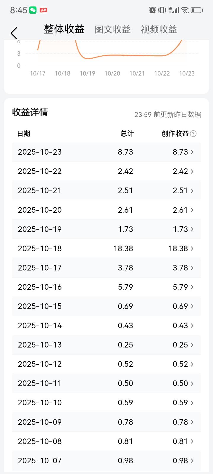 头条拥有12000粉丝是什么收入? 我每天不停写不停发 至少更新2~4篇 这几天终于有所新突破 从几毛钱进入到个位数不再为0的 我太开心了,马上是有进步 对于当初一心想在头条赚点钱的我 现在想法变了 以前太天真,想得太简单 经历长时间的“毒打” 心态变平和了 但还会继续写 有爆款固然好 没有就平常心 祝头条的兄弟姐妹们天天有爆款