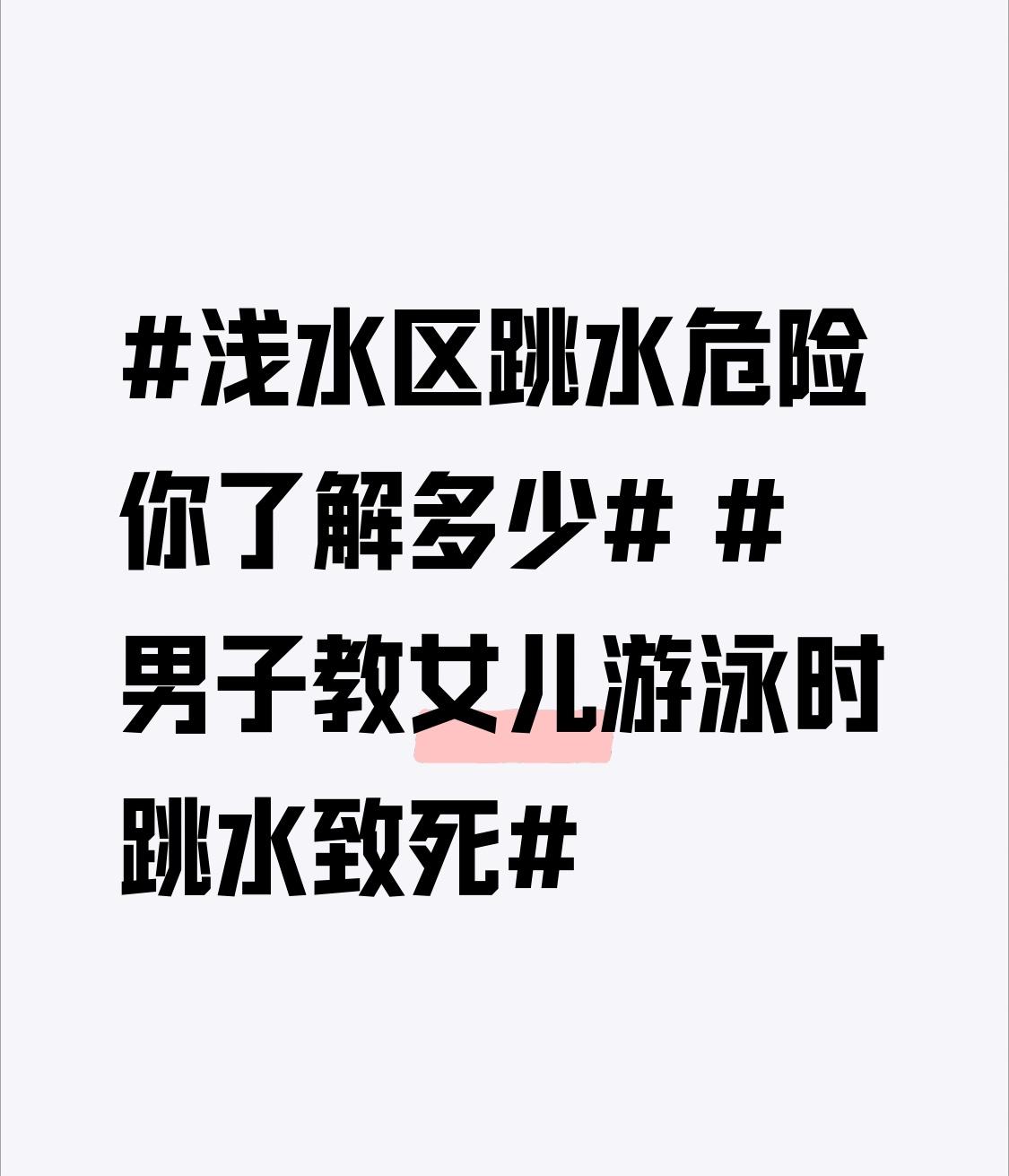 浅水区跳水危险你了解多少 男子教女儿游泳时跳水致死 浅水区跳水的危险,这次真的被血淋淋的现实狠狠上了一课。浙江宁波慈溪的博睿体育馆,一名男子教女儿游泳时,在浅水区跳水,头部撞池底颈椎断裂,脸朝下漂在水里。 可让人愤怒的是,16分钟里救生员就在旁边,却既没下水也没施救,还说“以为在玩”。家属悲痛欲绝,体育馆竟还不想担责,称救上来时人还活着,5天后才去世。16分钟啊,多少生机就这么没了。这也给所有人提个醒,浅水区跳水千万别做,也希望公共场所能真正担起责任,别让类似悲剧再发生。