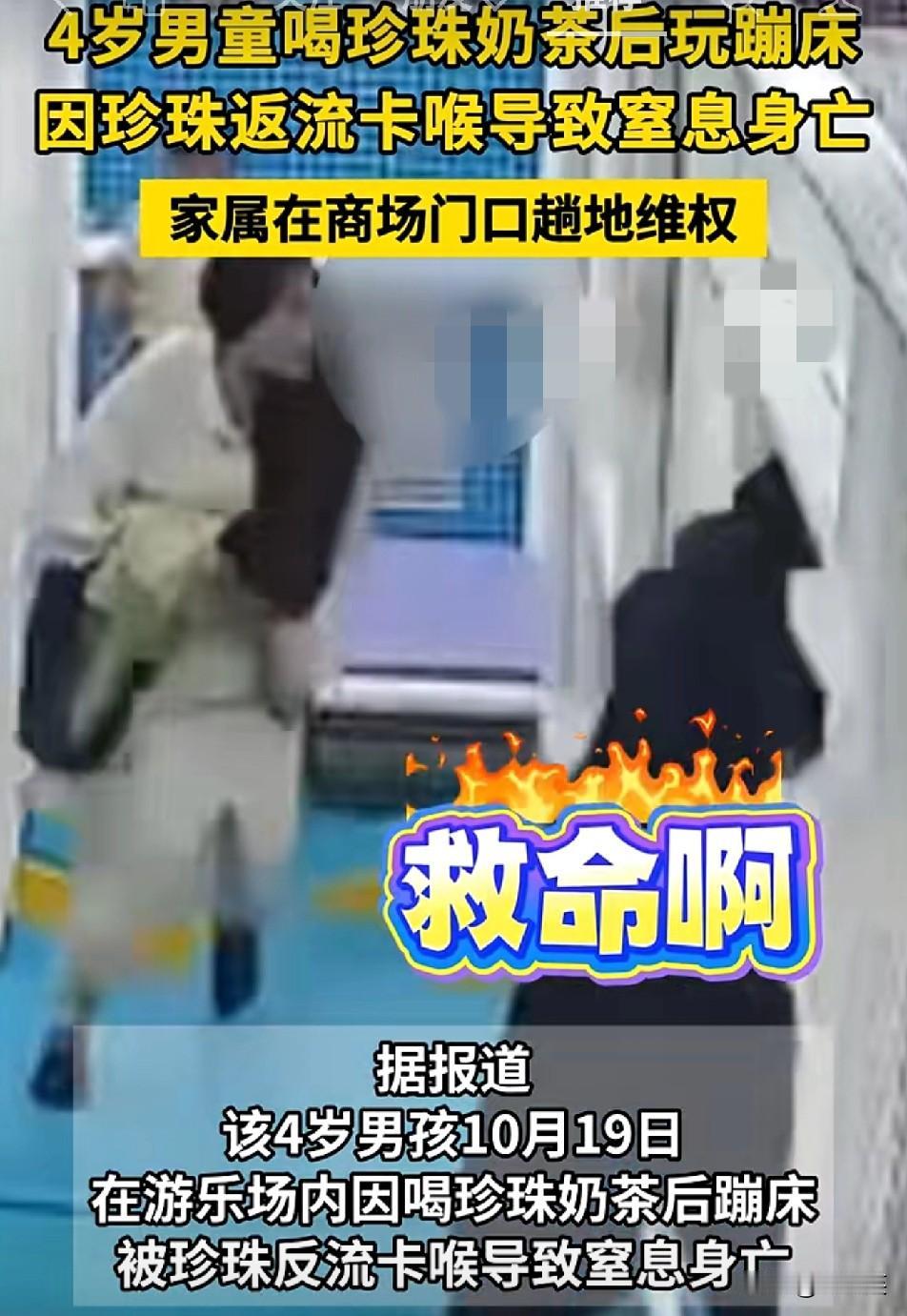 看到这事儿我心都揪紧了 上海一个4岁男童喝了珍珠奶茶后玩蹦床, 结果珍珠反流卡喉,窒息身亡了 家属在商场门口趟地维权 热评有人泪目:“这么小的孩子,太可怜了!家长得多难受啊!” 也有人反思:“以后真得注意,孩子吃这些带颗粒的东西,可不能大意。” 我们带孩子的时候是不是也有疏忽的时候 这事是提醒咱要时刻警惕,还是该追究商家和场所的责任? 你说,要是你遇到这种情况,能承受住吗?