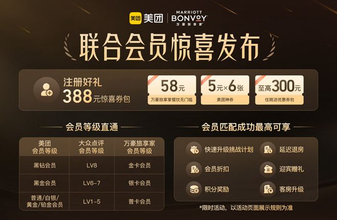 淘宝拉来了华住会,美团就找到了老牌酒店集团万豪做联动。“只要你是美团用户,就送你万豪会员。”黑钻对应金卡。黑金会员对应银卡。同时还有附赠的券包,和延迟退房等。