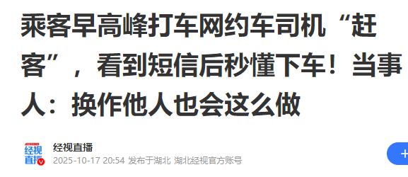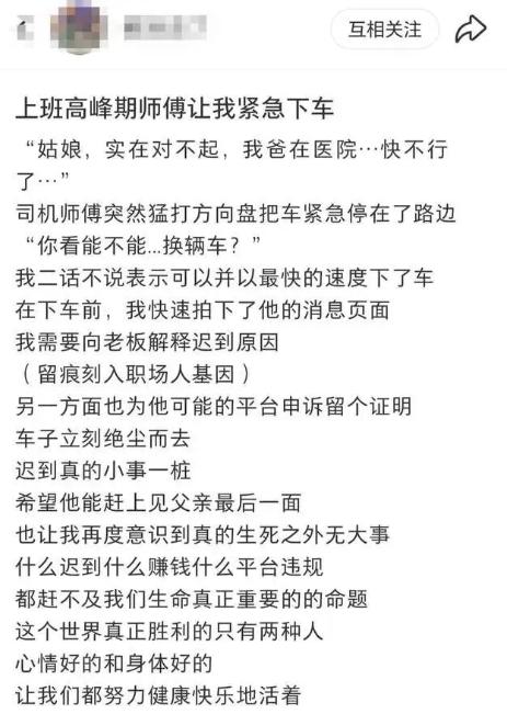 10月17日,北京,一女子早高峰刚打上网约车准备去公司上班,谁知开出去还没有1公里,司机却突然表示想让她下车,女子起初还很纳闷,可看到了司机的手机一眼后,立刻以最快的速度下了车!网友:换做是我也会这么做。 10月17日早上9点,北京的赵女士打了辆网约车去公司,车子开出大约1公里,司机突然把车停在路边,看起来很着急。 司机转过头向赵女士解释,刚收到姐姐的消息,说父亲在医院情况危急,他必须马上赶过去,他把手机屏幕给赵女士看了一眼,上面是家人发来的信息。 赵女士看完就说没问题,下车前用手机拍了张司机手机的照片,想着万一迟到可以向公司解释,当时正值早高峰,她在路边等了20多分钟才叫到下一辆车。 到公司后,赵女士把照片发给了领导说明情况,虽然迟到了,但领导了解原因后没有追究,赵女士后来说,这就是件小事,换谁遇到都会让司机先走。 类似的事在河北石家庄也发生过,两名大学生坐网约车返校,司机冯师傅开着开着突发急性脑出血,他强撑着把车停稳,让学生们下车。 学生发现司机状态不对,没有直接离开,他们改变了返校计划,一路陪着司机去医院,为抢救争取了时间,这件事当时在网上传开,很多人感叹遇到好乘客是司机的幸运。 网约车出行确实会遇到各种突发状况,有位新手司机不熟悉路况,错过了路口导致绕了远路,乘客看出来是新手,主动说自己也有责任没提前提醒,最后两人协商解决了费用问题。 还有次是乘客家里突然来电话说孩子发烧,司机二话不说改了路线,先送乘客回家。乘客本来担心会产生额外费用,司机说都是当父母的,这点忙算不了什么。 这些事听起来都不大,但确实能让人感受到温度,早晚高峰本来就容易让人烦躁,堵车晚点更容易起冲突,能在这种时候多替对方想一想,其实挺难得的。 从实际角度看,司机和乘客之间本来就是短暂的相处,一趟行程十几分钟到几十分钟,大家都想顺顺利利地完成。司机希望乘客好说话别找麻烦,乘客希望司机开车稳当别绕路。 但生活就是会有意外,司机可能遇到家里急事,乘客可能临时改变行程,这时候能不能相互理解,往往就决定了这趟行程是舒心还是添堵。 赵女士的选择其实很简单,看到司机确实有急事,下车重新叫车就是了,但换个角度想,如果当时她坚持不下车,或者要求赔偿损失,司机也很为难,毕竟平台规则摆在那,中途结束行程会影响评分。 好在赵女士没计较这些,司机才能及时赶到医院。 “哎哟我去,这司机师傅太不容易了!早高峰本来就累,还赶上父亲病危,这搁谁谁不着急啊。” “女子也是通情达理,二话不说就下车,这要换个脾气爆的估计就得吵起来。要我说,这种突发情况大家互相体谅一下,没毛病!” “看到司机姐姐发的那句“父亲快不行了”,我眼泪差点掉下来,人生在世,谁家没个急事?姑娘做得对,虽然自己上班迟到也着急,但见亲人最后一面是天大的事。” “给这位乘客点赞,也希望司机师傅能顺利见到父亲 我也有过类似经历!上次打车遇到司机接到孩子老师电话说发烧了,我立马让他靠边停,自己重新叫车,虽然迟到了半小时,但跟领导解释了一下,领导也表示理解。” “世上还是好人多,将心比心嘛,早高峰打车多难啊,尤其北京,等20分钟算快的了。” “这姑娘能这么痛快下车,说明心地善良。不过她也挺机智,知道拍聊天记录给老板看,不然迟到这么久还真不好解释,看来以后咱遇到特殊情况也得留个凭证。” “其实平台是不是也该考虑一下这种突发状况?比如给司机设个“紧急事由”按钮,遇到这种情况可以向平台报备,平台给乘客发张优惠券作为补偿,同时不影响司机评分,不然司机硬着头皮开,乘客不安全,司机心里也更煎熬。” 如果你遇到这种情况,是会像这位乘客一样选择理解下车,还是坚持让司机先送你到目的地?一起来聊聊你的想法或者分享你遇到过的暖心出行经历吧!   信源:经视直播