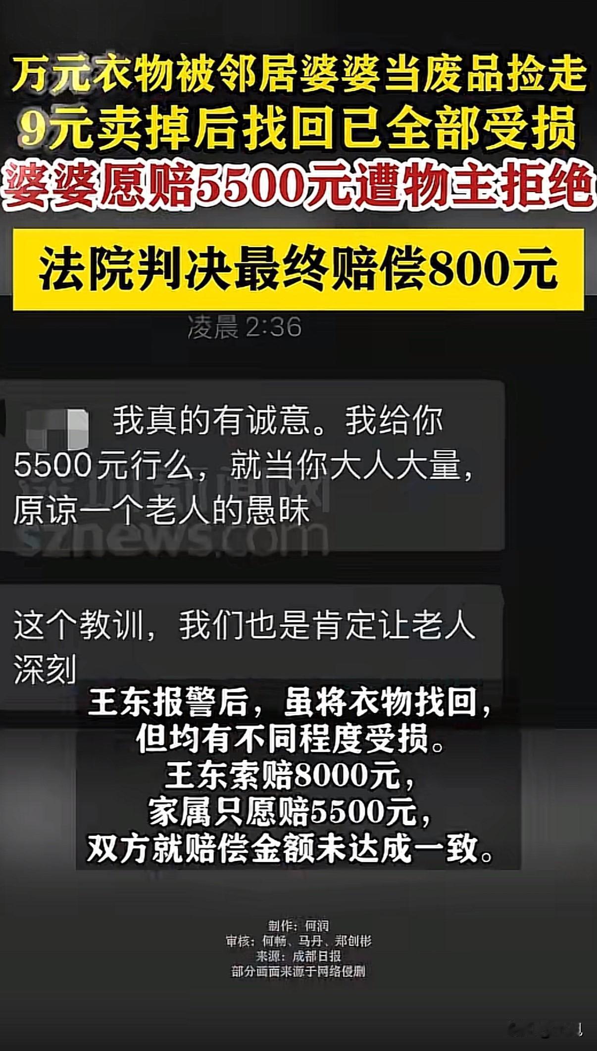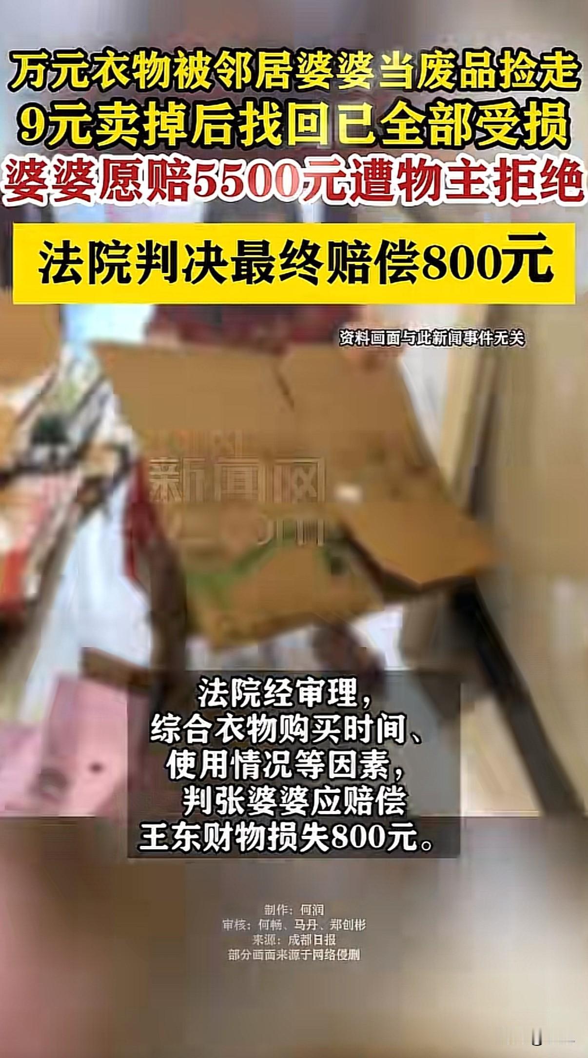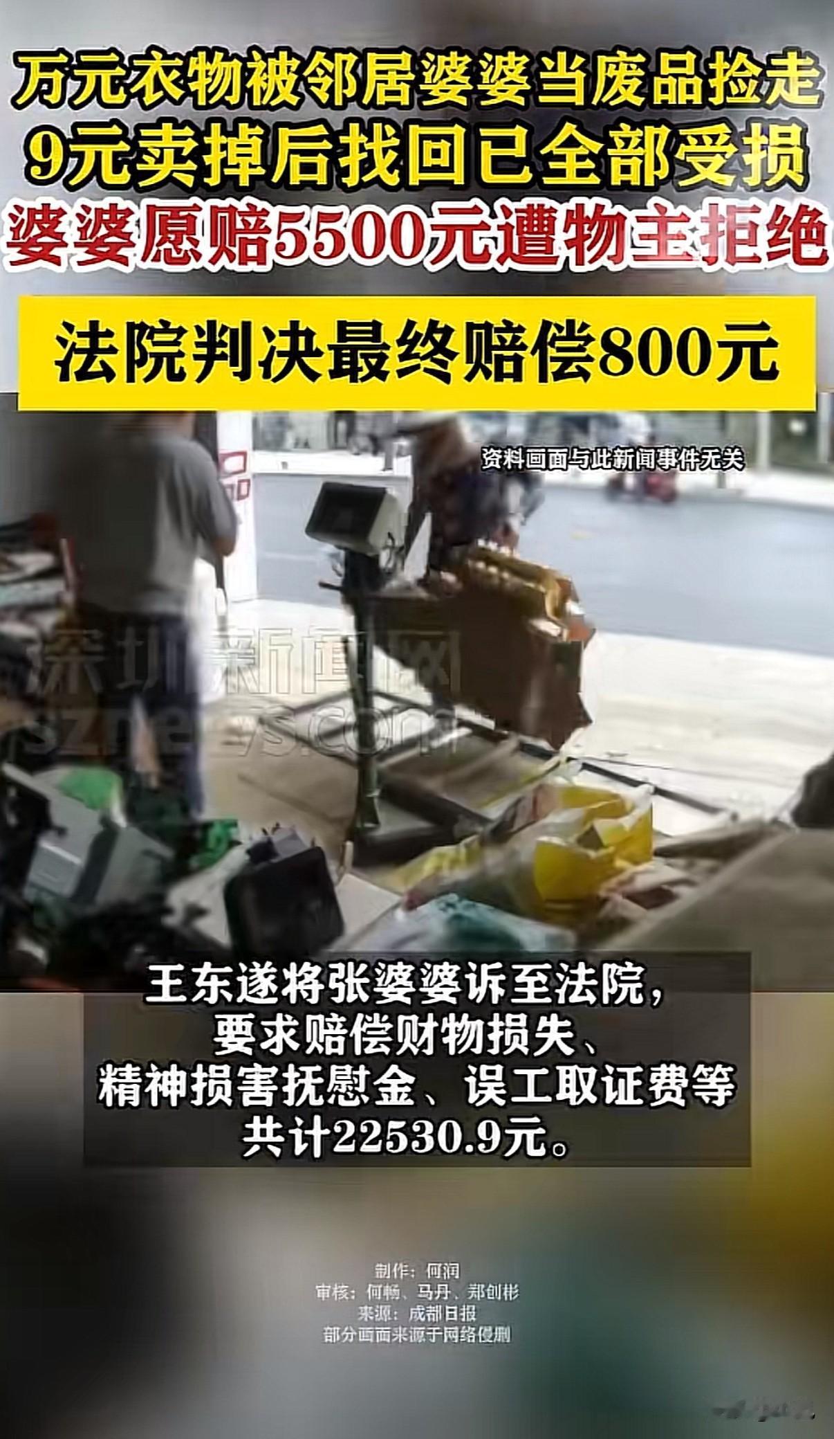 “真敢狮子大开口”!家门口放了个装衣服的袋子。里面是年轻人准备退货的始祖鸟冲锋衣,买的时候花了一万五。 八十八岁的邻居老太太路过。她眼神不太好,以为是废品。直接拎走,九块钱卖给了收废品的。 年轻人发现后报警。老太太和儿媳妇赶紧去废品站把衣服找回来。但衣服已经变了样:油渍、破洞、拉链也坏了。 年轻人要求赔八千。老太太家说赔五千五。没谈拢。 事情闹到法院。年轻人列出一张清单:衣服损失、精神赔偿、误工费…总共两万二。 法院最后判了八百。 这个数怎么来的?衣服穿了一年多,本来就在折旧。不能按原价算。东西放公共区域,自己也没保管好。老太太不是故意偷,事后也积极补救。 两万二的索赔,确实有点夸张。那几件衣服虽然脏了破了,但没到完全不能穿的地步。 现在很多人爱把贵重物品随手放。楼道、门口、公共长椅。丢了就要求全价赔偿。别人成了你粗心大意的买单者。 老年人捡废品也是个问题。不是所有放门口的东西都是垃圾。子女得多提醒。 八百块的判决,双方都长了教训。保管好自己的东西,动别人东西前多问一句。 这事你怎么看?