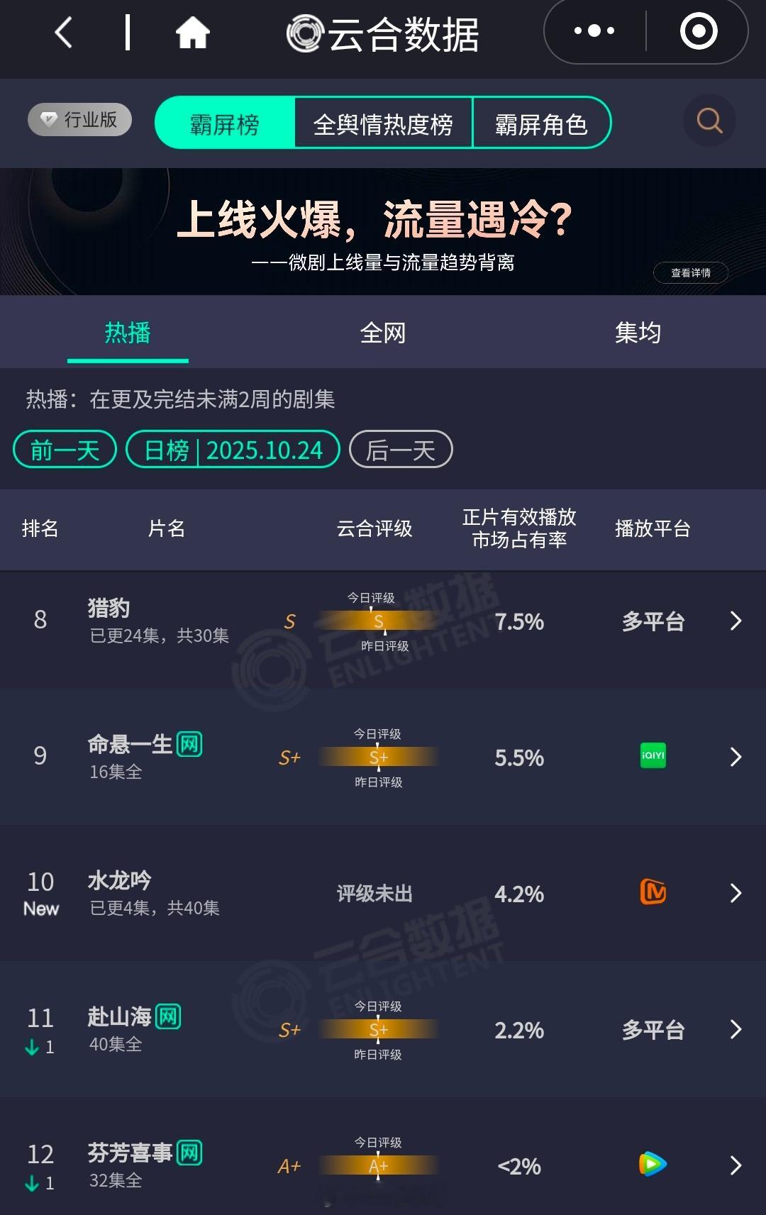 云合☁️入青云12.1%,暗河传7.9%,余生有涯7.5%
