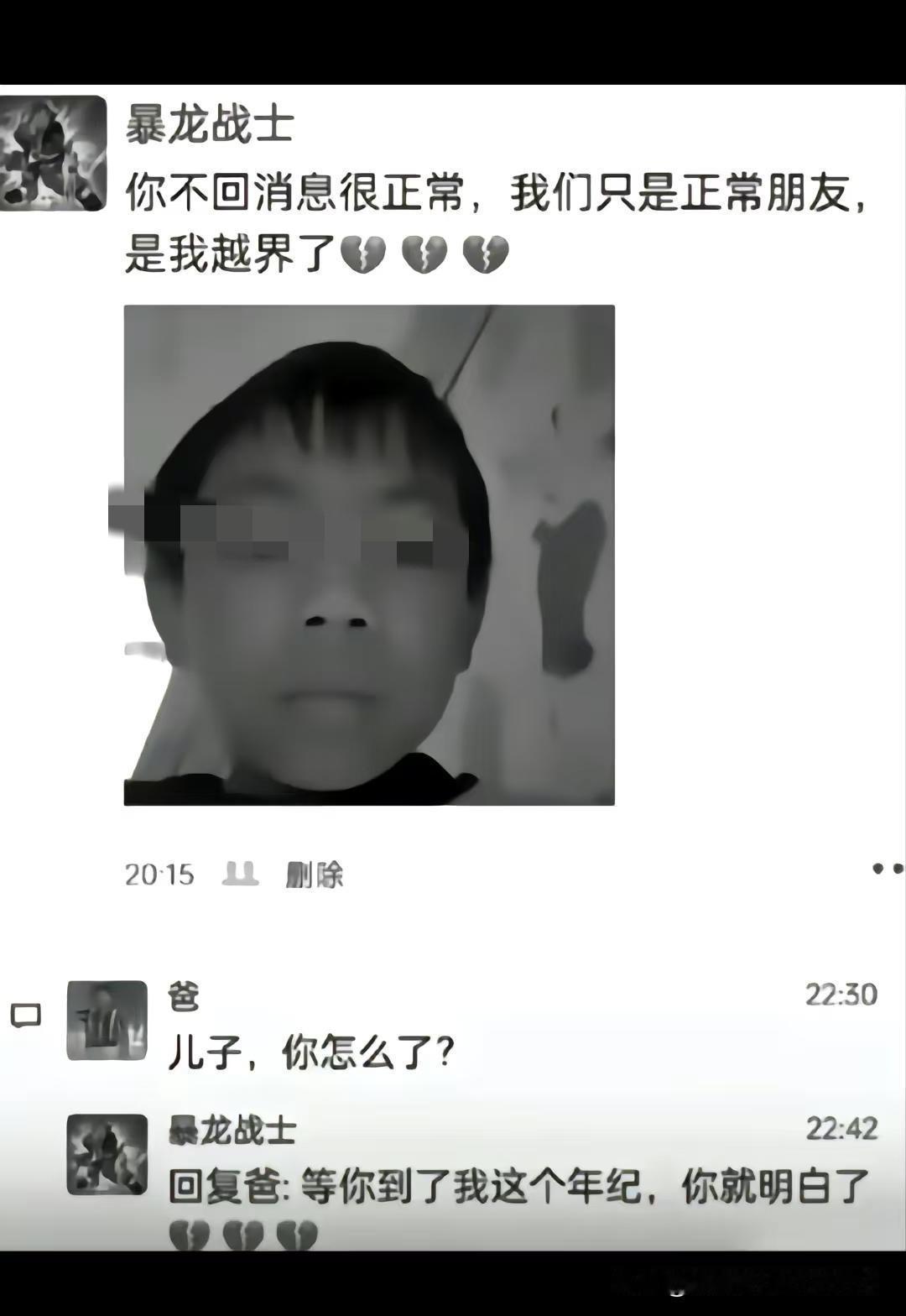 暴龙战士: 你不回消息很正常!我们只是正常朋友,是我越界了!(心碎了表情包) 爸爸:儿子你怎么了? 暴龙战士:你不懂,等你到了我这年龄,你就明白! 哈哈哈,真的是少年亦有愁,如滚滚长江东逝水,郎骑竹马绕青梅! 老父亲确实不懂,不过估计回来要胖揍一顿熊儿子,小小年纪就学人家多愁善感!
