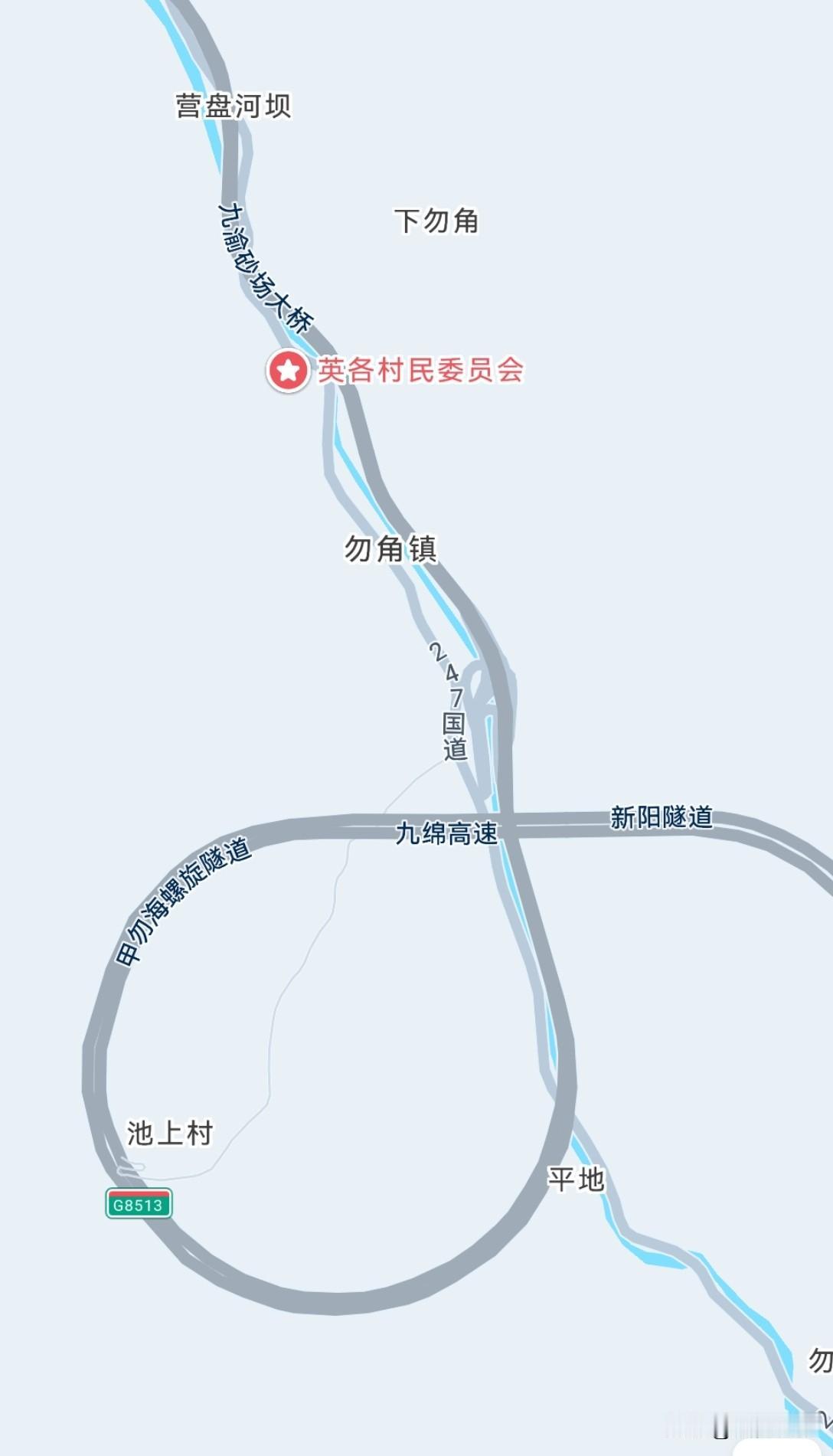 九绵高速勿角镇这个圆形弯应该是不得已而为之, 有点类似于雅西高速栗子坪的那个弯。要不然就像G247道路那样,沿着河流走不更好吗?
