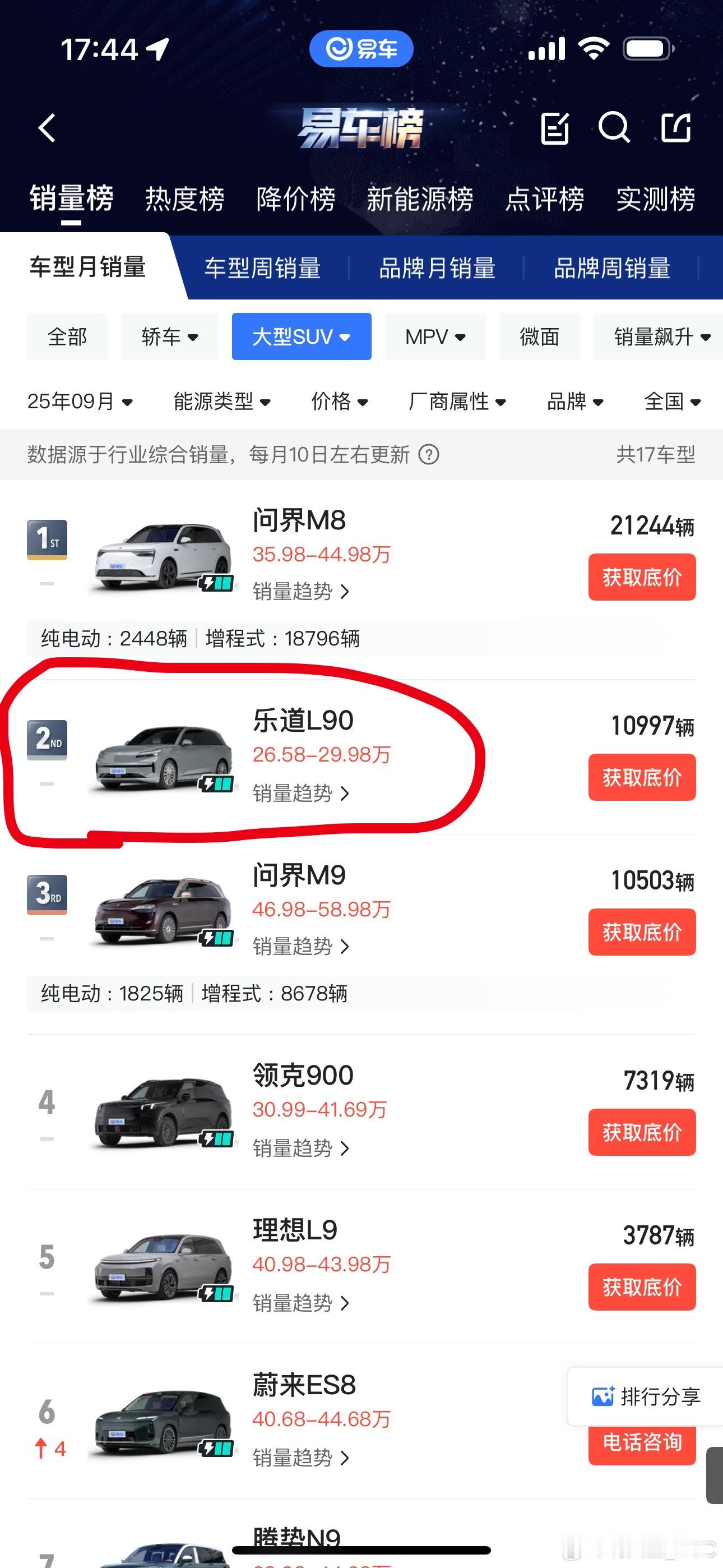 不管是销量,还是交付速度,L90在纯电大型SUV里都是第一。9月份,在所有新能源大型SUV里,也排到了第二。
