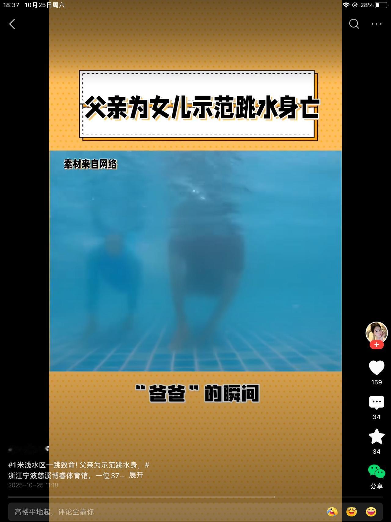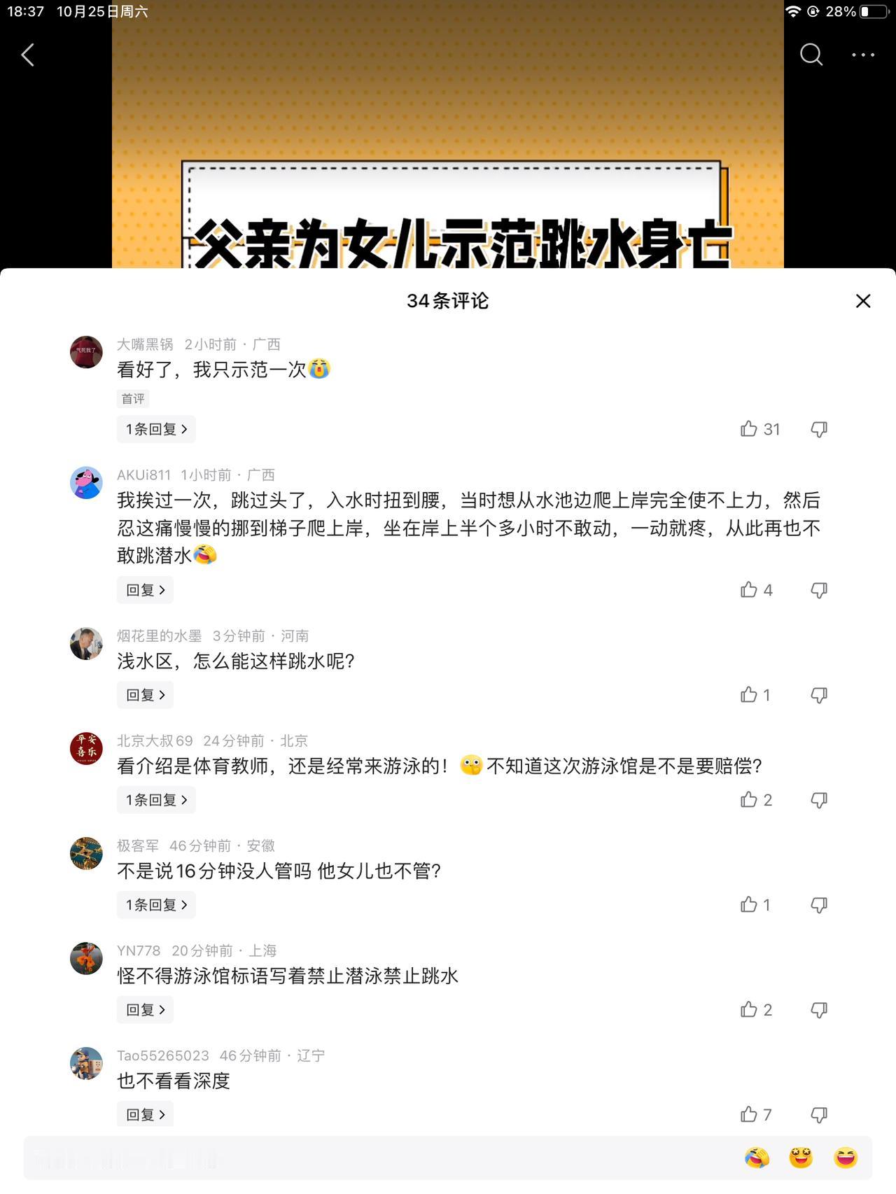 这个都刷到了吧?好可惜。一早上推送了好多次,不看都不行。 37岁的男子,有人说是体育老师,给7岁女儿示范跳水动作。触底,伤到脖子了吧?之后漂浮水中头朝下,五分钟后才有人赶过来,已经晚了。女儿哭喊爸爸,也无人发现。不怪别人大意了,这是个会水的人。 谁能料到他竟然在那么浅的地方跳水。按理说,不应该不知道的。这是常识,风险太大了,代价太大了。别说游泳馆赔不赔偿的问题。人没了,好好的家庭蒙上了一层阴影。孩子后续的很多年,都会很压抑。七岁,记事了。心理疏导是必须要有的。孩子太难了。 今天跟同事聊天她说你现在为啥不找个八点对八点的活儿干,我说我体格不好,省着点用这个身体,给孩子一个囫囵妈。多活些年。多陪伴一些年头儿。 陪伴是最长情的告白。有时候,觉得想给孩子更好的。啥叫好。好好活着比啥都强。有些危险,能不参与就不参与。这边打起来了,离得远一些。别崩血身上。那边车着火了,只要人跑出来了,车无所谓。离远一点不是坏事。安全第一重要。