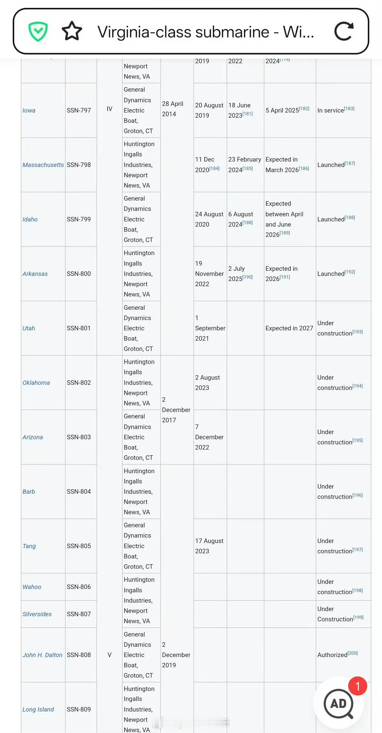 美国上一艘入坞敷设龙骨的还是2023年8月的SSN-802,805。美国的两家船厂按计划每年应该进行1~2艘新艇的敷设龙骨工作,但由于未知技术难题已经暂停了两年多。