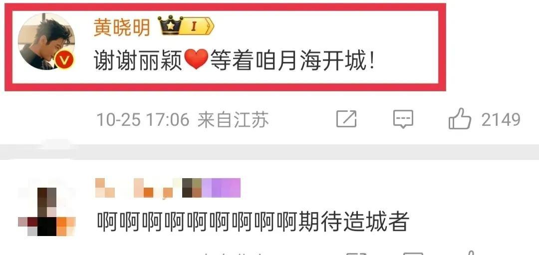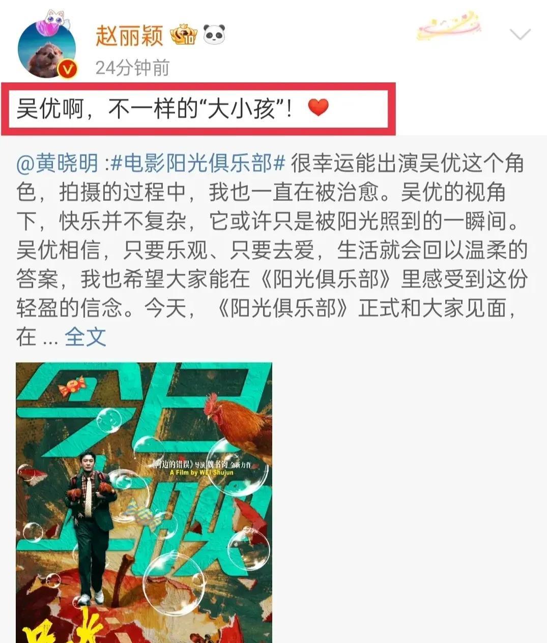 哇塞宣传小能手赵丽颖上线啦!10月25日晚,赵丽颖发博来给黄晓明宣传电影:“吴优啊,不一样的“大小孩”!”随后,晓明哥也在评论区留言:“谢谢丽颖,等着咱月海开城!”懂了,颖宝和晓明哥的对手戏一定很精彩!超级期待这个年代基建大剧《造城者》的! 颖宝好久不见呀!虽然前不久才在沁园直播中见到过新鲜的颖宝,不过对我们来说还不够!幸好颖宝明天又有一个直播,太开心了!又可以见到新鲜又美丽的颖宝啦!看到颖宝和晓明哥的互动,我想《造城者》拍摄氛围不错诶!期待《造城者》早日定档!期待与李秋萍镇长早日见面呀!那颖宝我们下个活动见呀!