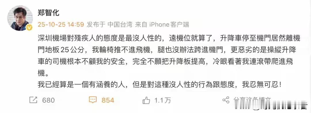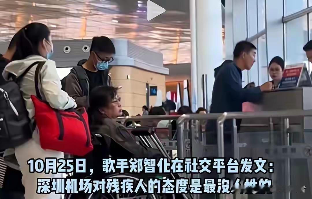 罕见郑智化生气了,那个曾经唱“水手”的他。 台湾残疾人歌手郑智化发文谴责:“深圳机场没人性,看我连滚带爬进飞机!” 郑智化也应该去过很多地方,看来这一次真的是受到了不一样的待遇,还是真的让人不舒服。 那个升降车司机肯定已经后悔了,本来以为戏弄的只是个普通人,谁知道碰上了有话语权的
