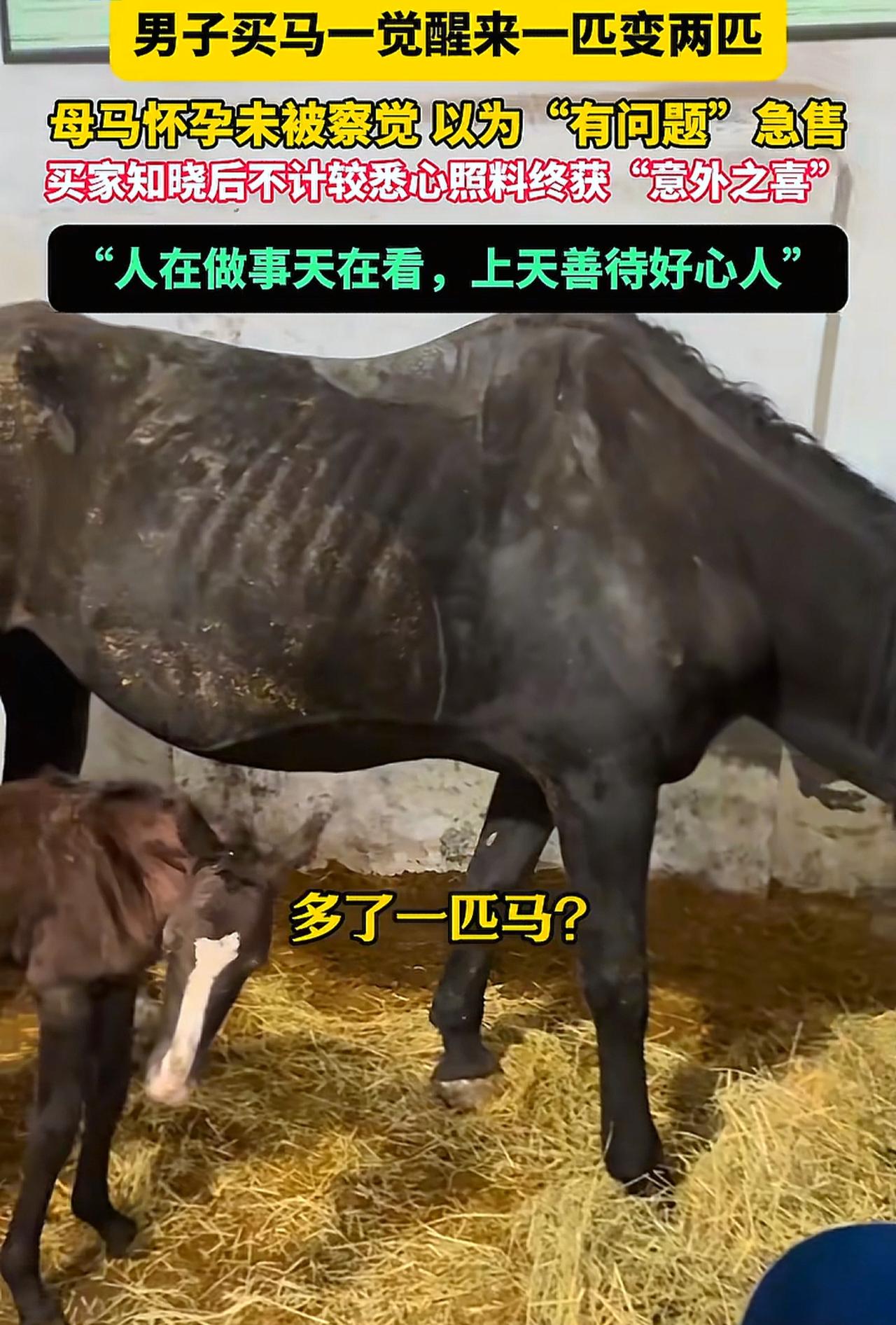 山东淄博一男子早晨去马厩喂马,突然听到一阵嘈杂声,走近一看却发现马厩里多了一匹小马驹,正在它妈妈身旁努力地站起来。想到这匹马因为“生病”被原来的主人抛弃,男子突然有点感动,称意外之喜来的猝不及防,不是金钱能衡量的。 谁能想到,这匹母马当初被原主人当“病马”抛弃,说肺有问题跑几步就喘,大哥不忍心才买回来照料。看着马儿肚子一天天大,还以为是病情加重,天天提心吊胆,结果竟是怀了半年多的孕!其实这哪是“病马”,分明是被粗心耽误的“准妈妈”啊!大哥的善良没白费,这份回报比金钱珍贵多了——你对生命多一份包容,生活就会悄悄给你惊喜。 你们身边有没有这种“善良换来意外好运”的事儿?快来评论区说说~