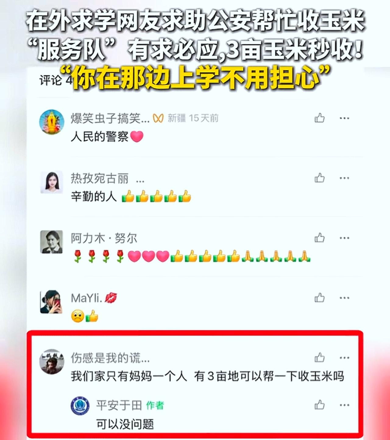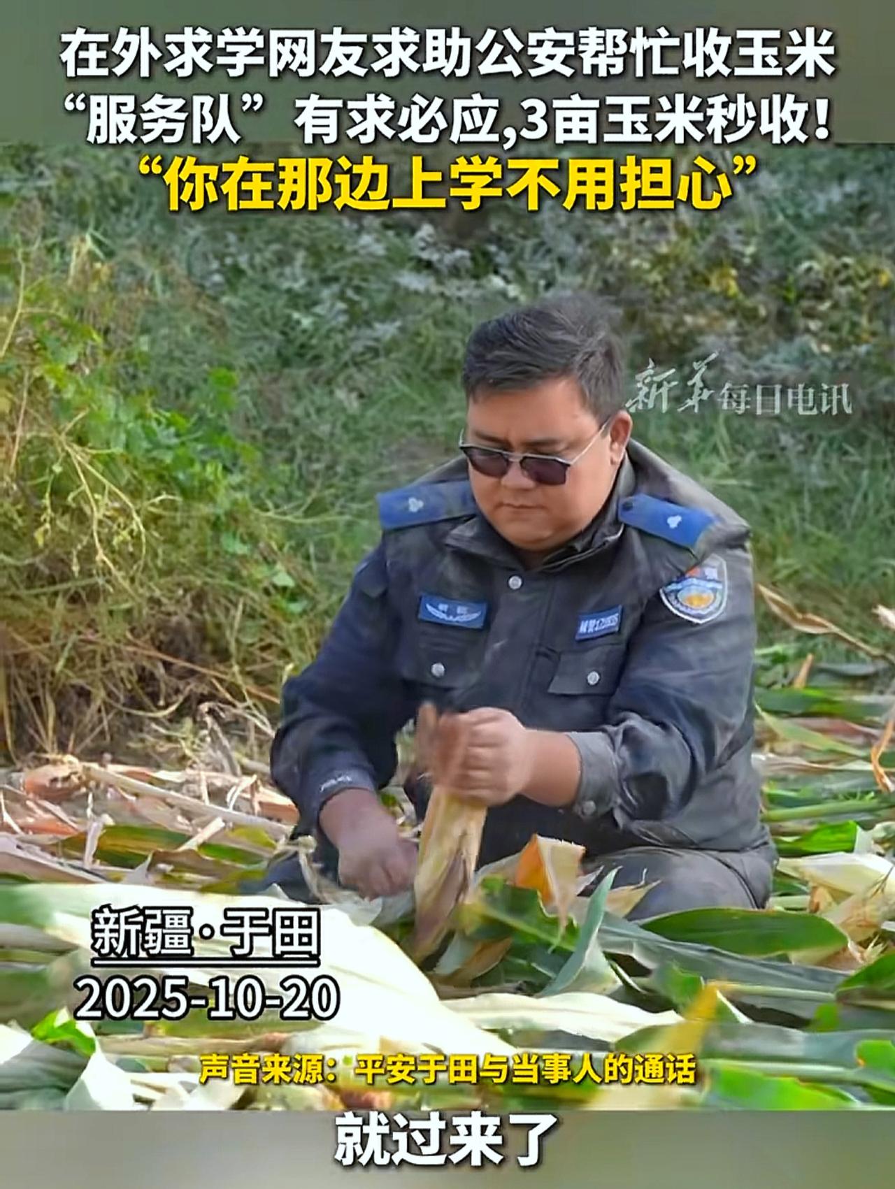 新疆一名在外求学的大学生 给当地的民警留言 说家里的三亩玉米没人收, 只有老妈一个人在家 希望警察同志能帮帮忙 民警不光回应还真上门干活, 这份接地气的贴心真不是吹的, 必须狠狠点赞!但说真的,暖心归暖心, 我反倒觉得这事儿藏着个小问题—— 警察同志的本职是护平安,不是当农忙帮手啊! 新疆地域广,民警出警动辄几十上百公里, 本来就比其他地方累得多,手里的紧急警情、 民生案件一大堆。要是正帮着收玉米, 突然接到报警,赶不过去可就麻烦了。 其实这种农忙难题,完全能联动社区、 志愿者或者农机队来搭把手,既帮农户解了围, 也能让民警专心干好主业。 你们觉得该怎么平衡民警的暖心帮扶和本职工作呢? 欢迎来评论区聊聊你的想法!