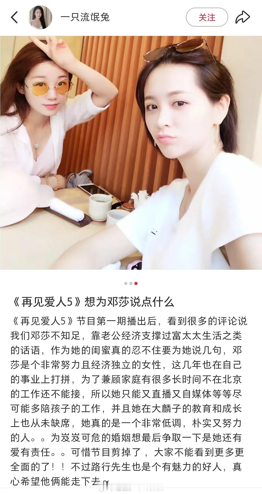 邓莎事业合伙人兼多年好友为邓莎发声,说邓莎嫁给路行之后的婚姻状况也是 AA制…是一个经济独立的人,网友说除了邓莎本人说其他人都没有资格。