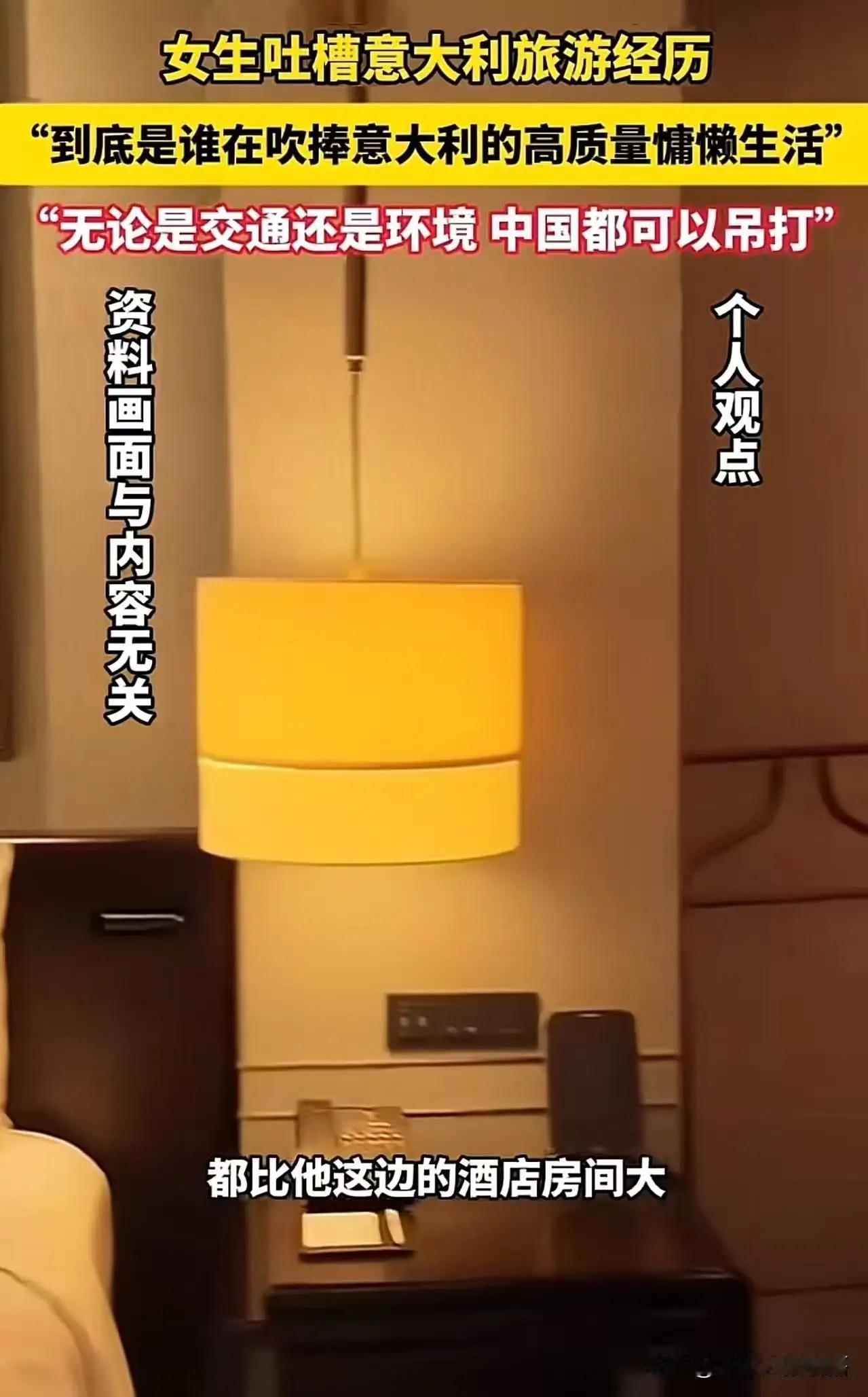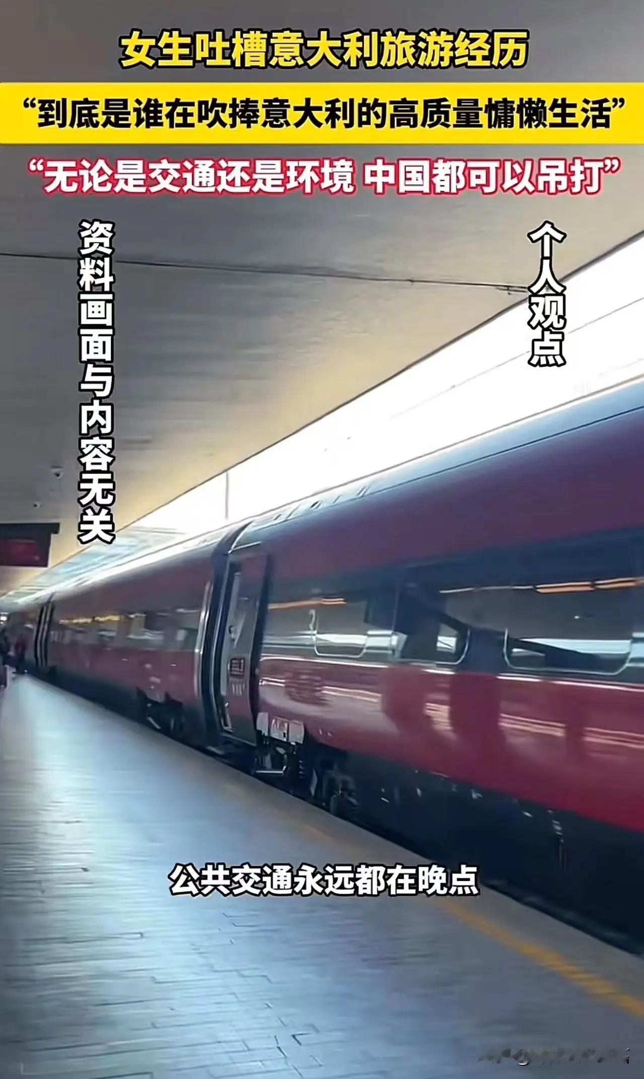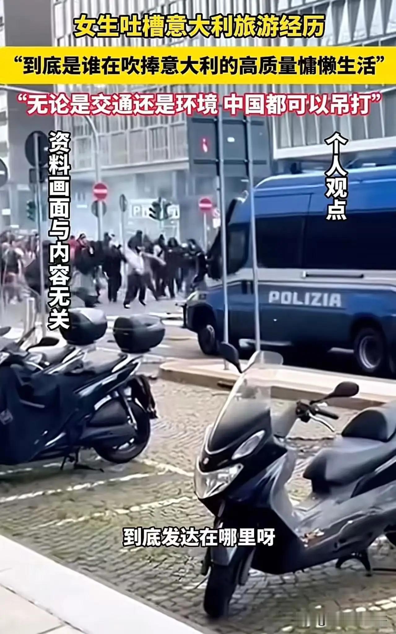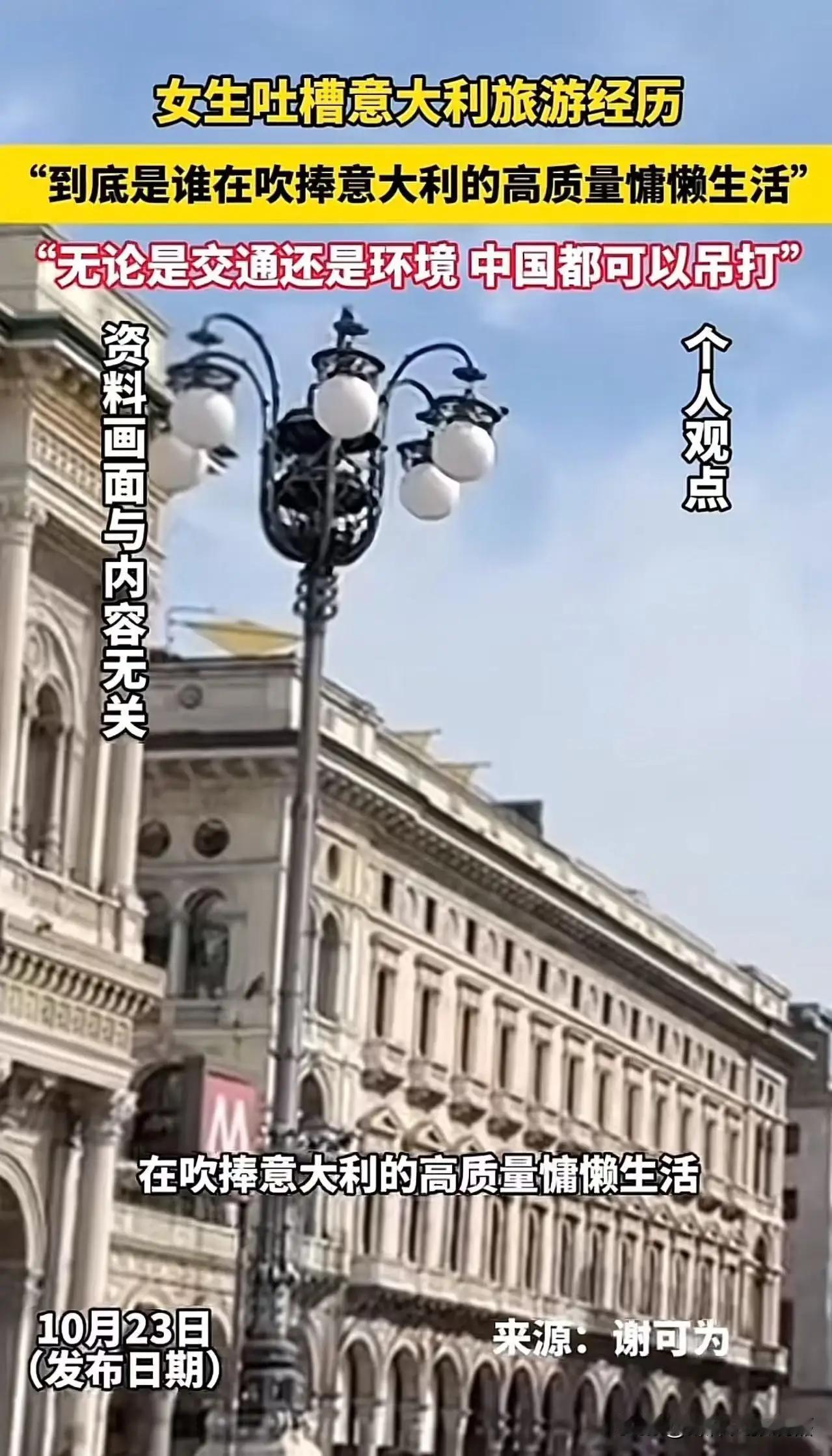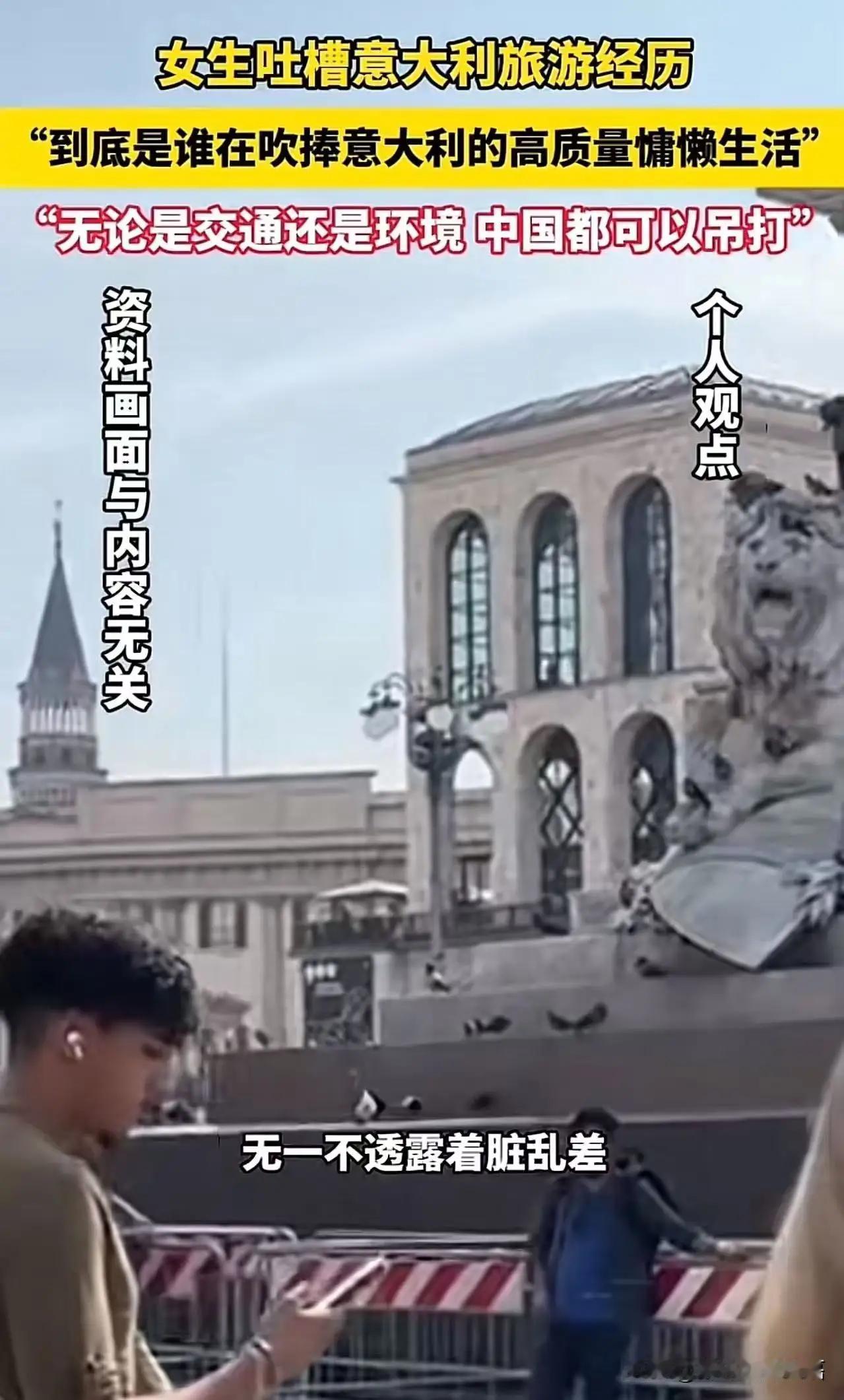 “到底是谁在吹捧意大利的高质量懒慵生活,无论是交通还是环境,中国都可以吊打”女士吐槽意大利旅游经历,直呼去过意大利的人嘴巴真严!网友:最好的最安全的地方就是中国,不接受反驳。 女生在网上看到很多意大利旅游的攻略,吹捧意大利生活惬意,从世上之都米兰到浪漫的佛罗伦萨,再到奥黛丽赫本的罗马假日,无一不让女生向往。 终于女生存够了钱,坐上了去意大利的飞机来到了意大利,可是眼前的景象让她大吃一惊。 这里无一不透露着脏乱差。朋友在米兰的第一天,那个包在她自己的背上,就被人翻了个底朝天。 女生说:“到底发达在哪里呀?交通萎靡不振,还动不动发生罢工!去机场25公里的车程,要换四趟车,地下追地上跑,坐完公交换火车,坐完火车换地铁,坐完地铁又换火车,公共交通永远都在晚点! 我们就是在中国吃的太好了,同等价值的酒店,我们在中国住的那个房间的厕所,都比这边的酒店房间大。无论是交通还是环境,中国的任何一座城市都可以吊打它!他这个国家唯一牛的地方,就是它的建筑,除了建筑一无是处。” 这番话,顿时引发了网友们的热烈讨论。有的点赞,有的吐槽,但更多的人开始反思:我们是不是太容易被表象迷惑了?在朋友圈里,意大利的浪漫、文艺、优雅似乎成了“标签”,但真相究竟是什么?难道我们一直在盲目崇拜“异国情调”,而忽略了脚下的土地和身边的生活? 其实,这个世界上,没有哪个国家是真正完美的。意大利的美丽固然令人心醉,但它的乱象、交通的落后、公共卫生的不足,也是真实存在的。我们习惯用“高大上”的标签去评价一个国家,却忽略了那些藏在背后的不堪与不足。反观中国,或许有人觉得“发展太快,环境还没跟上”,但你有没有注意到,正是这些“缺点”,在推动着我们不断前行?中国的城市在高速发展,基础设施日新月异,公共服务逐步改善。 有人说,意大利的建筑令人心醉,那是因为他们懂得保护历史,善于雕琢文化,但忽略了他们的公共管理和生活细节。而中国,正是因为我们在“吃得好、住得大、交通便捷”上持续努力,才有了今天的繁荣。我们不应该盲目崇拜“洋气”的标签,而是要看到背后的努力和潜力。 当然,这篇吐槽也让人反思:我们是不是太容易被“表象”迷惑?是不是太容易被“浪漫”蒙蔽了双眼?其实,最重要的,是认清自己国家的优势和不足。我们要有自信,也要有危机感。中国的城市在不断变化,环境在改善,交通在提速。我们要相信,未来的中国,会比任何国家都更美好、更宜居。 最后,我想说,旅游是为了体验不同的生活,但更重要的是,我们要用一颗平常心去看待世界。别让“表象”左右了你的判断,也别让“偏见”遮蔽了你的眼睛。中国在不断努力,我们有理由为自己骄傲,也有责任去改善不足。别再盯着别人的“优越感”,把目光放在身边的改善和进步上,或许,你会发现,真正的幸福和美好,就藏在我们自己脚下的土地上。 所以,朋友们,别只看“表面风光”,多去感受、多去了解,才能真正懂得:最美的风景,是不断前行的自己!头号周刊 意大利