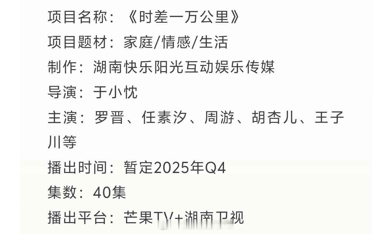罗晋、任素汐、周游、胡杏儿、王子川主演的《时差一万公里》播前招商,预计Q4湖南卫视、芒果tv播出