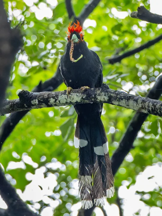 原创拍摄于2025.10 蓬冠地鹃,Rough-crested Malkoha,鹃形目杜鹃科蓬冠地鹃属。菲律宾吕宋岛特有,是典型的热带湿润低地森林分布的大怪鸟。 蓬冠地鹃最显著的特征是独特的红羽松散构成的眉纹,像是一个蓬松的头冠,另外全身羽毛黑色带蓝绿色光泽,尾尖白色。 这种大鸟鲜红的眉毛太怪异了,而且发出吵闹的叫声。不过他们都在树冠上跳动,又很快,好难拍到啊。这一只刚好捉到一只虫,停留了几秒钟,给了一点面子。 地鹃是一种不会巢寄生的杜鹃哦。