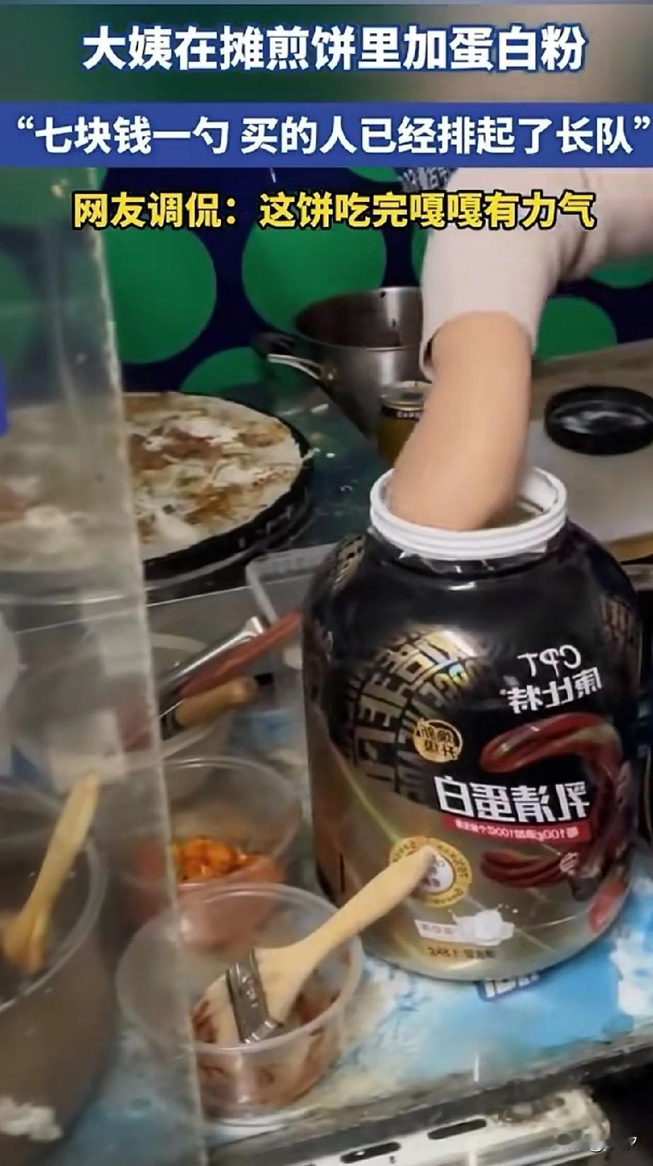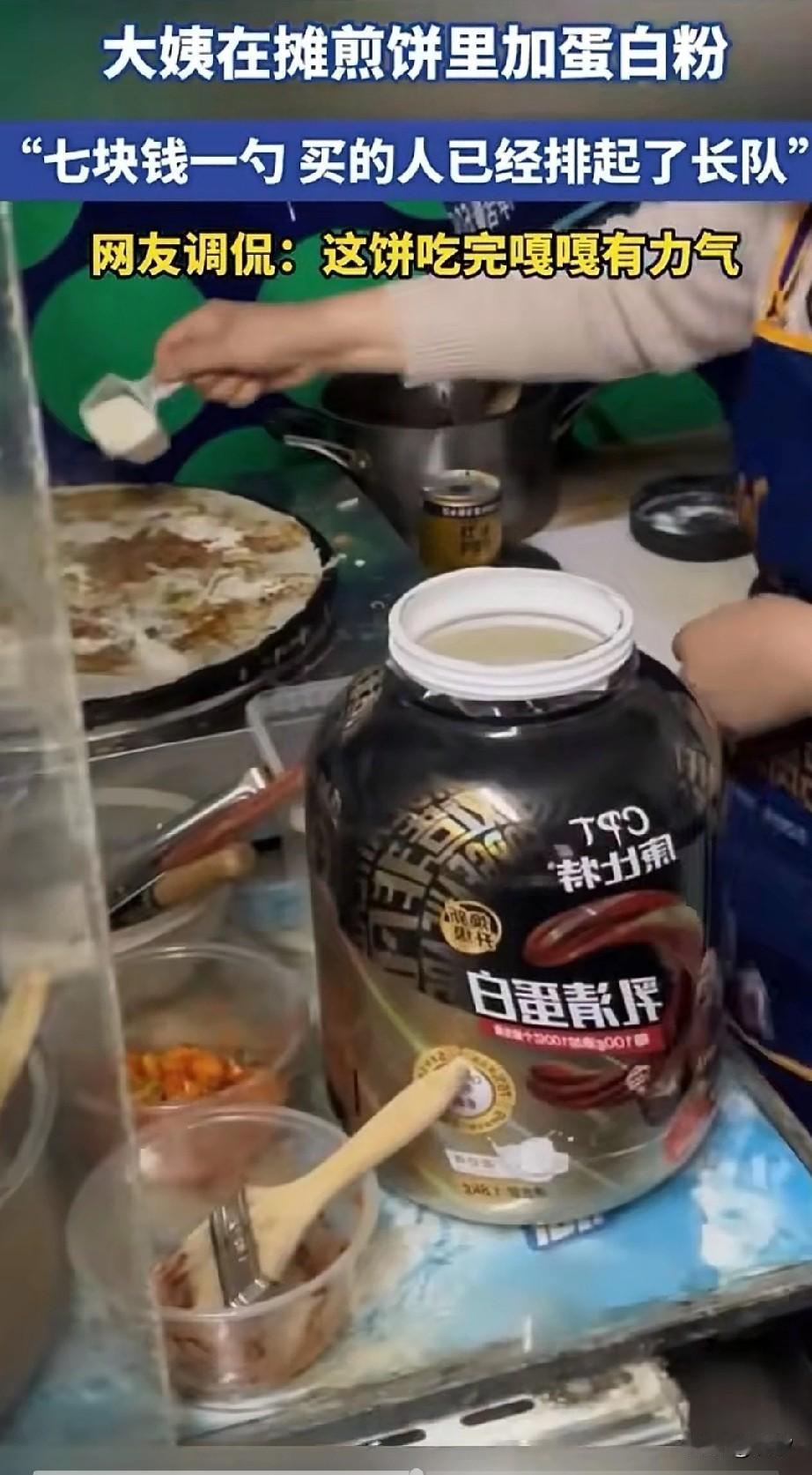 大姨的煎饼摊火了, 因为她的煎饼和其他人家的不一样, 人家的煎饼吃了没啥感觉, 她家的煎饼吃了倍有力气, 原来大姨有秘方, 七块钱一勺蛋白粉, 明码标价童叟无欺, 让你看着一勺一勺加的, 难怪生意好, 买的人排起了长队, 大家都知道蛋白粉一般都是健身爱好者买来健身用的, 吃多了会长肌肉, 这咋还用到了煎饼上, 话说蛋白粉可以在煎饼上加热吗? 有没有懂行的来聊一聊? 煎饼 蛋白质煎饼 山东特产煎饼 农家小吃煎饼 山东大姐煎饼