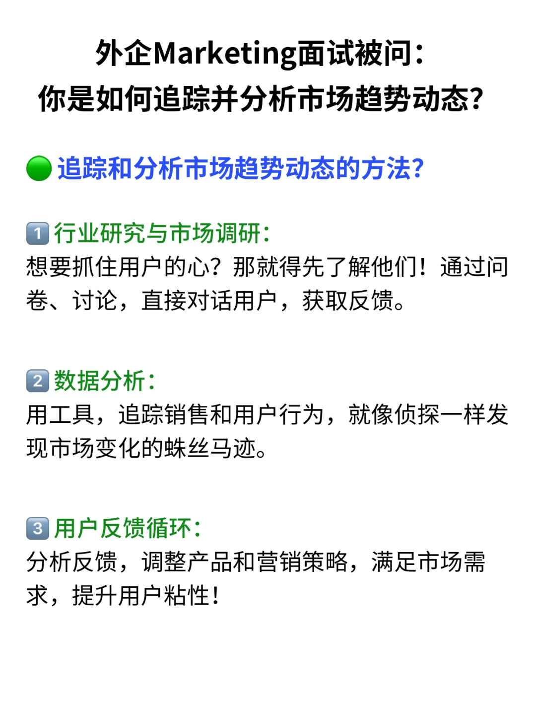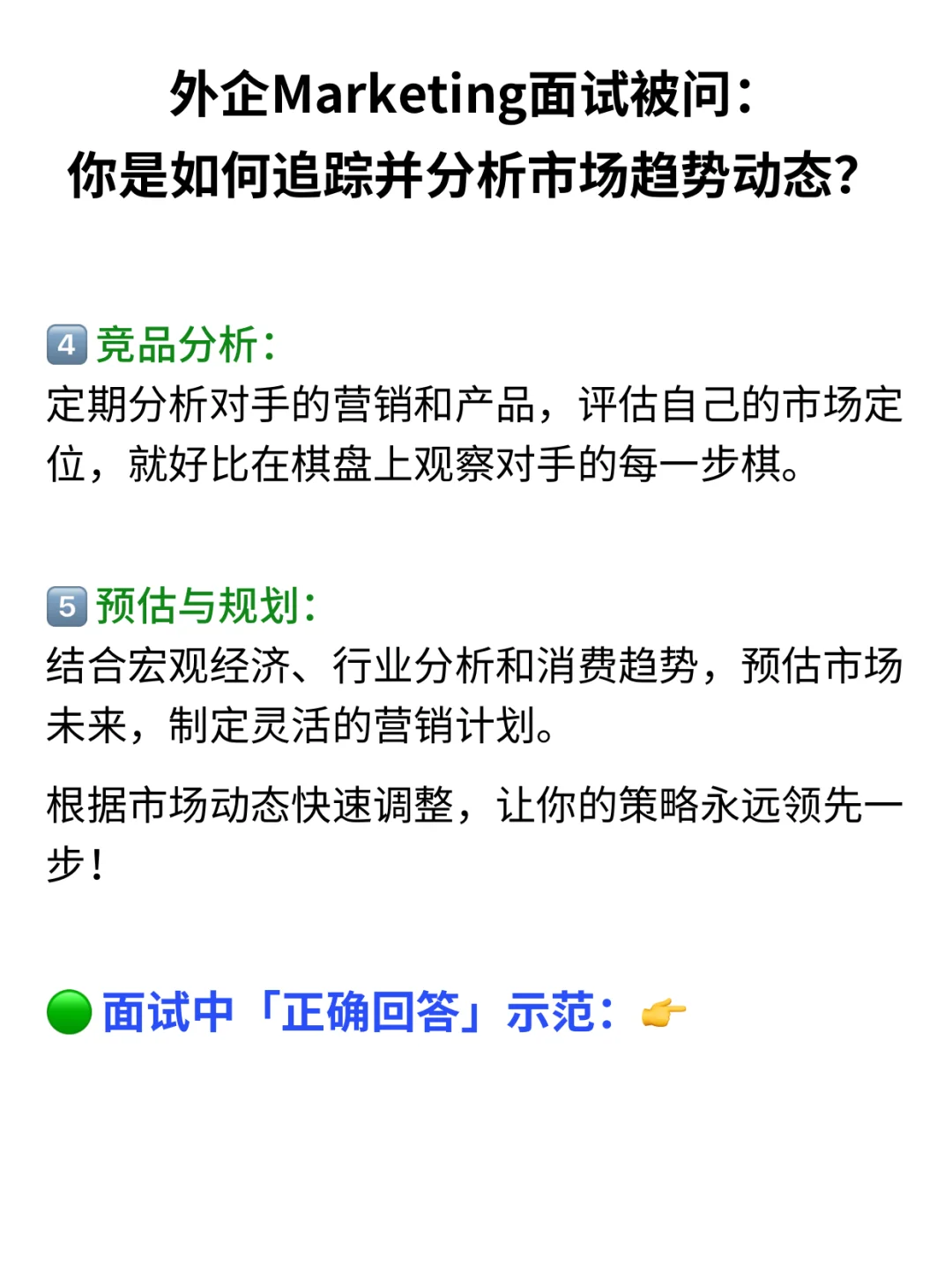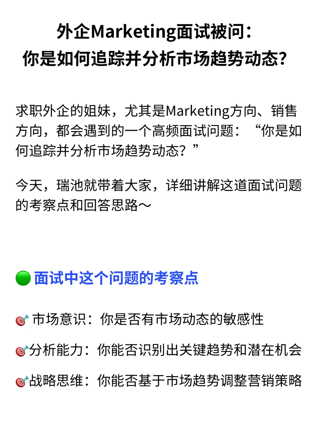 我是瑞池,500强外企业务团队Senior Manager · mkt面试时很可能会被问到一个高频问题:“什么是Market Analysis?” · 一、什么是Market Analysis? Market Analysis市场分析,对Marketing部门来说,就像拥有一张通往市场机会的藏宝图 ✅Market Analysis 主要包括以下几个方面: ▫️价格动态:把握价格变化,能帮助我们更好地判断市场走势 ▫️消费者行为:消费者的偏好和行为就像是风向标,他们的每一个选择,都可能影响产品甚至整个行业的发展 ▫️行业动态:环境、技术这些因素会影响行业格局 ▫️时尚潮流:趋势也会带动消费偏好 · 二、Market Analysis 常用方法 1️⃣行业研究与市场调研 想要真正打动用户,先要了解用户!可以通过问卷调查、深度访谈等方式获取真实反馈,为产品和Marketing决策提供支撑 · 2️⃣数据分析 借助数据分析工具,追踪销售数据和用户行为,从细节中发现市场变化,为策略调整提供依据 · 3️⃣用户反馈循环 持续收集并分析用户反馈,根据市场需求不断优化产品和Marketing方案,这样能有效提升用户粘性,让产品与市场需求始终对齐 · 4️⃣竞品分析 定期研究竞争对手的产品和MKT动作,评估自身定位和优势,就像下棋时观察对手每一步棋,做到知己知彼 · 5️⃣趋势预判与战略规划 结合宏观经济、行业趋势与消费数据,提前做出预判,制定灵活的市场计划。随着市场变化,能够及时调整,让你的策略始终保持领先 · 三、面试中这个问题的回答重点(详细内容👀看上图‼️) 四、Mkt面试回答参考(详细内容👀看上图‼️) · 🙋‍♂️我是瑞池,500强外企面试官 👉(求职版) 带你轻松拿下外企offer -