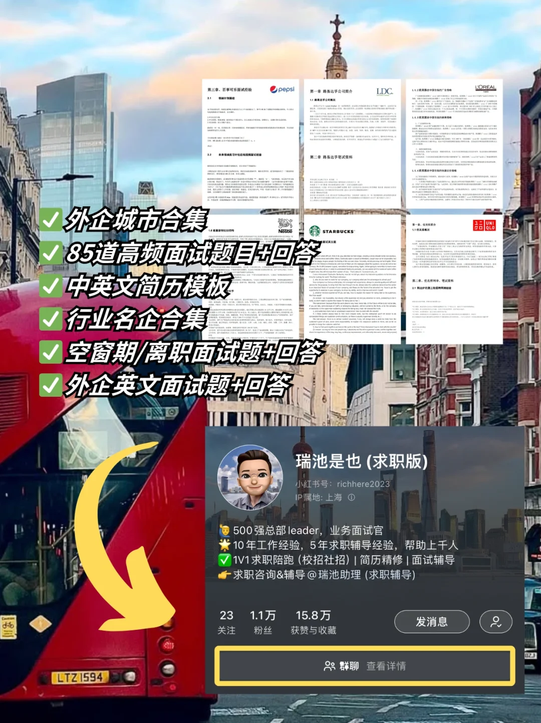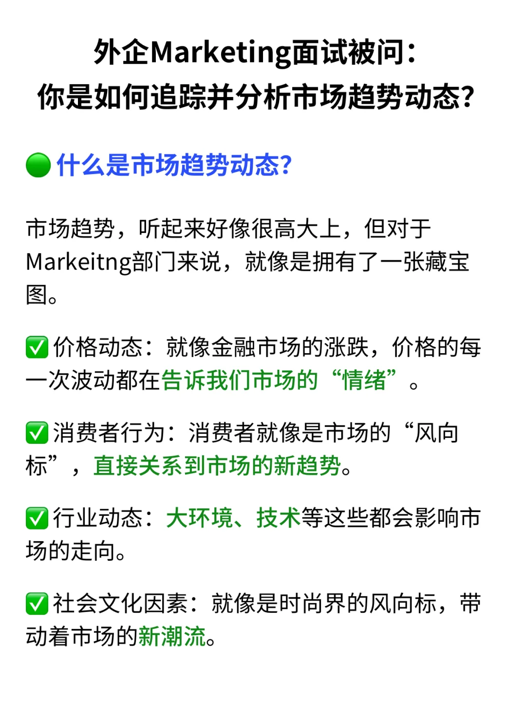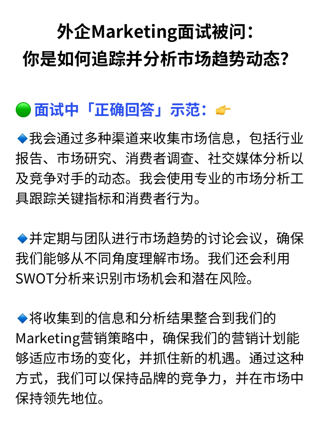 我是瑞池,500强外企业务团队Senior Manager · mkt面试时很可能会被问到一个高频问题:“什么是Market Analysis?” · 一、什么是Market Analysis? Market Analysis市场分析,对Marketing部门来说,就像拥有一张通往市场机会的藏宝图 ✅Market Analysis 主要包括以下几个方面: ▫️价格动态:把握价格变化,能帮助我们更好地判断市场走势 ▫️消费者行为:消费者的偏好和行为就像是风向标,他们的每一个选择,都可能影响产品甚至整个行业的发展 ▫️行业动态:环境、技术这些因素会影响行业格局 ▫️时尚潮流:趋势也会带动消费偏好 · 二、Market Analysis 常用方法 1️⃣行业研究与市场调研 想要真正打动用户,先要了解用户!可以通过问卷调查、深度访谈等方式获取真实反馈,为产品和Marketing决策提供支撑 · 2️⃣数据分析 借助数据分析工具,追踪销售数据和用户行为,从细节中发现市场变化,为策略调整提供依据 · 3️⃣用户反馈循环 持续收集并分析用户反馈,根据市场需求不断优化产品和Marketing方案,这样能有效提升用户粘性,让产品与市场需求始终对齐 · 4️⃣竞品分析 定期研究竞争对手的产品和MKT动作,评估自身定位和优势,就像下棋时观察对手每一步棋,做到知己知彼 · 5️⃣趋势预判与战略规划 结合宏观经济、行业趋势与消费数据,提前做出预判,制定灵活的市场计划。随着市场变化,能够及时调整,让你的策略始终保持领先 · 三、面试中这个问题的回答重点(详细内容👀看上图‼️) 四、Mkt面试回答参考(详细内容👀看上图‼️) · 🙋‍♂️我是瑞池,500强外企面试官 👉(求职版) 带你轻松拿下外企offer -