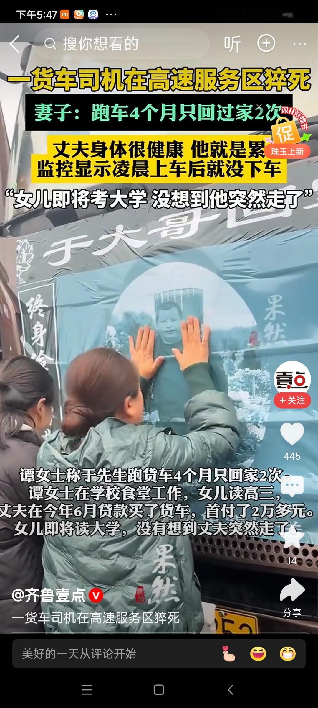 悼高速猝死货车司机 轮碾风霜路几千, 服务区中命倏悬。 妻言字字皆含泪, 生计谁怜这苦肩。