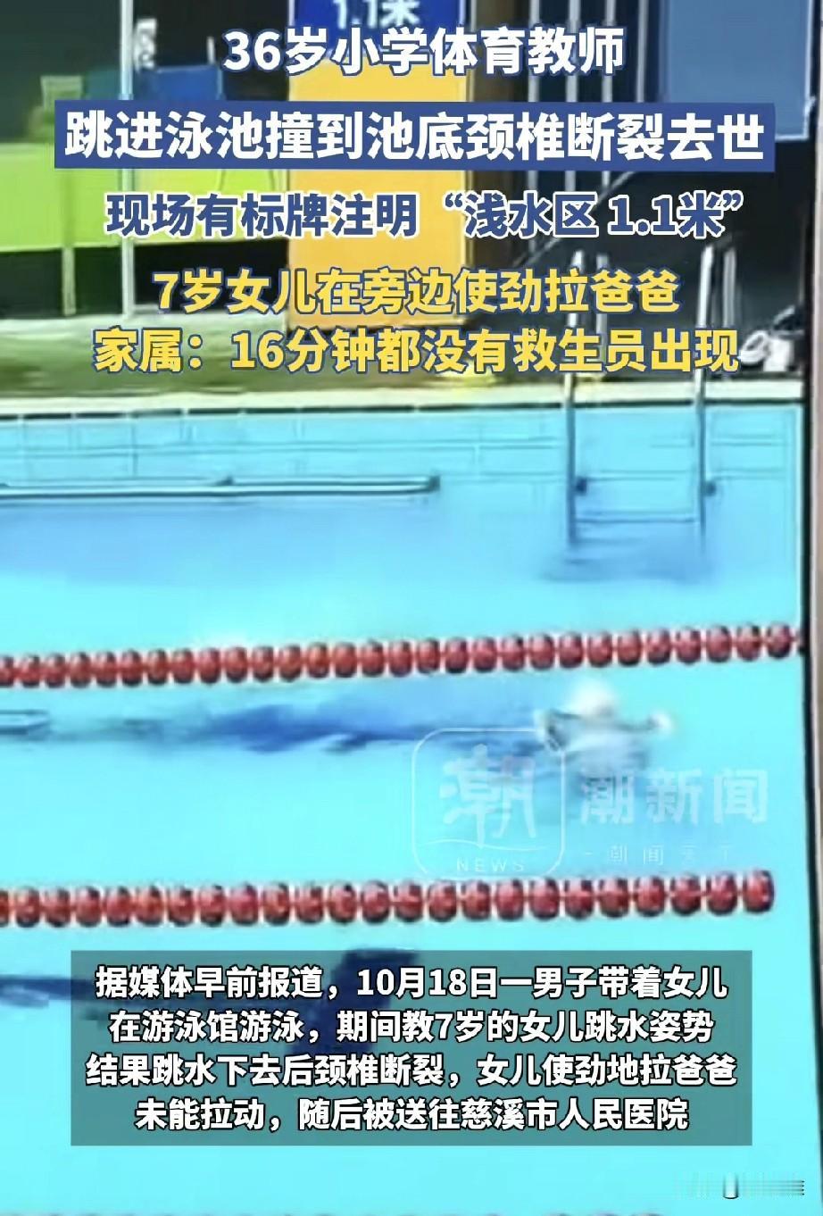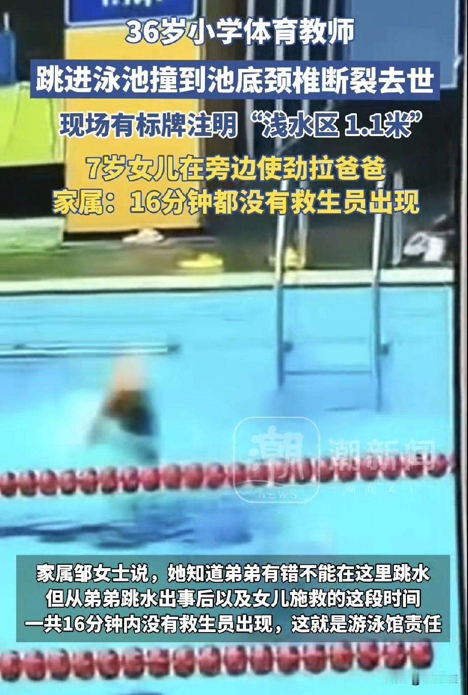 “让人悲痛。”七岁女儿眼睁睁的看着36岁的爸爸死在自己面前。36岁的胡某是位体育老师,经常带孩子进行各种体育锻炼。 10月18日,他带孩子去游泳馆进行跳水训练,没想到跳下去之后,因为水位过浅,导致颈椎断裂昏睡过去。 七岁的女儿看见爸爸躺在水里一动不动,想要把他拉起来,但是拽不动,因为年龄过小也不懂得向周围的人求救。 当时游泳馆里有包括救生员在内的十几个人,大家都以为父女俩在玩游戏,也没有人当注意到危险,就这样过了16分钟之后,女儿才想起回家喊妈妈。 等到母女俩赶到游泳馆的时候胡某已经被救护车拉走,送到医院之后,因为长时间溺水这位父亲永远无法醒来。 事后游泳馆回应:“游泳馆内禁止跳水”,而胡某家属则认为,胡某在浅水区跳水导致颈椎断裂的责任在他自己,但是在长达16分钟的时间里胡某都没有得到游泳馆的救助,则是导致胡某死亡的主要原因,这部分责任在游泳馆! 我觉得这件事主要责任在这个死者,他作为一个成年人,对在浅水区跳水的危险应该有预判,不应盲目自信,付出了生命的代价。不应该怪孩子,才七岁的孩子,没经历过什么事,不知道怎么办,只想到找妈妈 ,家长平时说不定让她不要和陌生人说话呢,所以导致她不会向周围的陌生人求救,但是谁能想到有这种事呢。