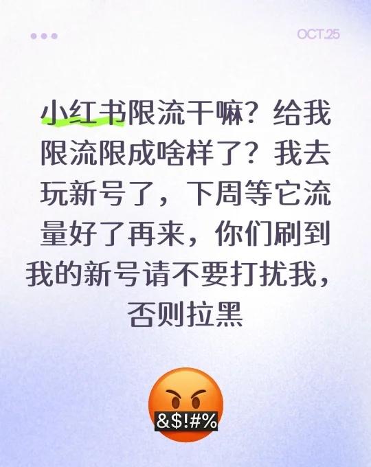 通知 限流干嘛?给我限流限成啥样了?我去玩新号了,下周等它流量好了再来,你们刷到我的新号请不要打扰我,否则拉黑