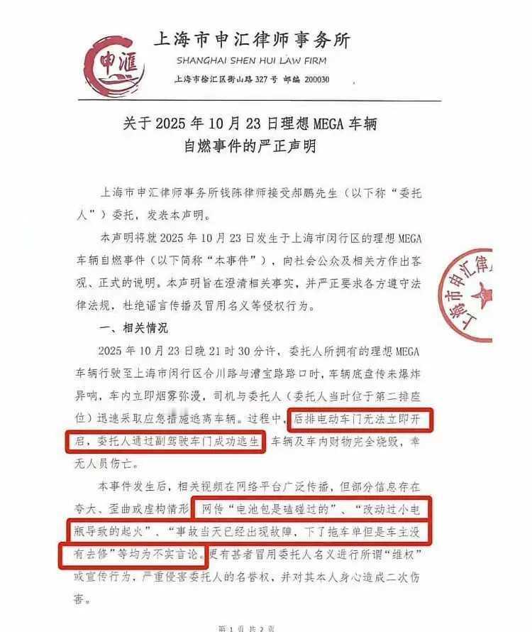 这事儿确实挺吓人的。10月23号晚上,上海合川路那边,一辆开着的新能源车底盘突然冒火花,没几秒钟整个车就烧起来了,特别快。 好在车里两个人反应是真的快。后排的人发现电动车门打不开,一点没犹豫,马上从副驾驶爬出来了。副驾驶那位也是在断电前最后一刻把门打开了,这才抢出来一条生路。他们刚跑出来没几步,整辆车就烧成个火球了,想回去拿东西根本不可能,那温度太高了。 现在他们律师出来说了几点挺重要的。第一是澄清了几个谣言,说什么电池之前磕碰过、改过小电瓶、或者当天本来就出问题了没去修——这些全都是瞎传的,没那回事。第二是现在居然有人冒充当事人在网上搞什么“维权”,这纯属是给人二次伤害,太缺德了。 说回新能源车这个话题。现在电动车确实有好处,比如充电便宜、样子也好看,算是未来趋势。但这次出事也看出来,一旦电池着火,那速度比燃油车快太多了,留给你逃生的时间窗口特别短。燃油车虽然加油贵点,但一般着火没那么猛,逃生时间能多一点。 说到底,不管买什么车,安全永远是第一位的。希望厂家能把电池安全做得更靠谱点,听说那个固态电池以后可能会好很多。咱们消费者也得心里有数,选车时候多考虑考虑自己的实际情况。 最后说一句,这事儿官方还在调查,大家别急着乱传消息,等个准确结果比什么都强。那俩年轻人能活下来真是万幸,他们的应急反应值得咱们学习——关键时刻,真是一秒钟都不能耽误。