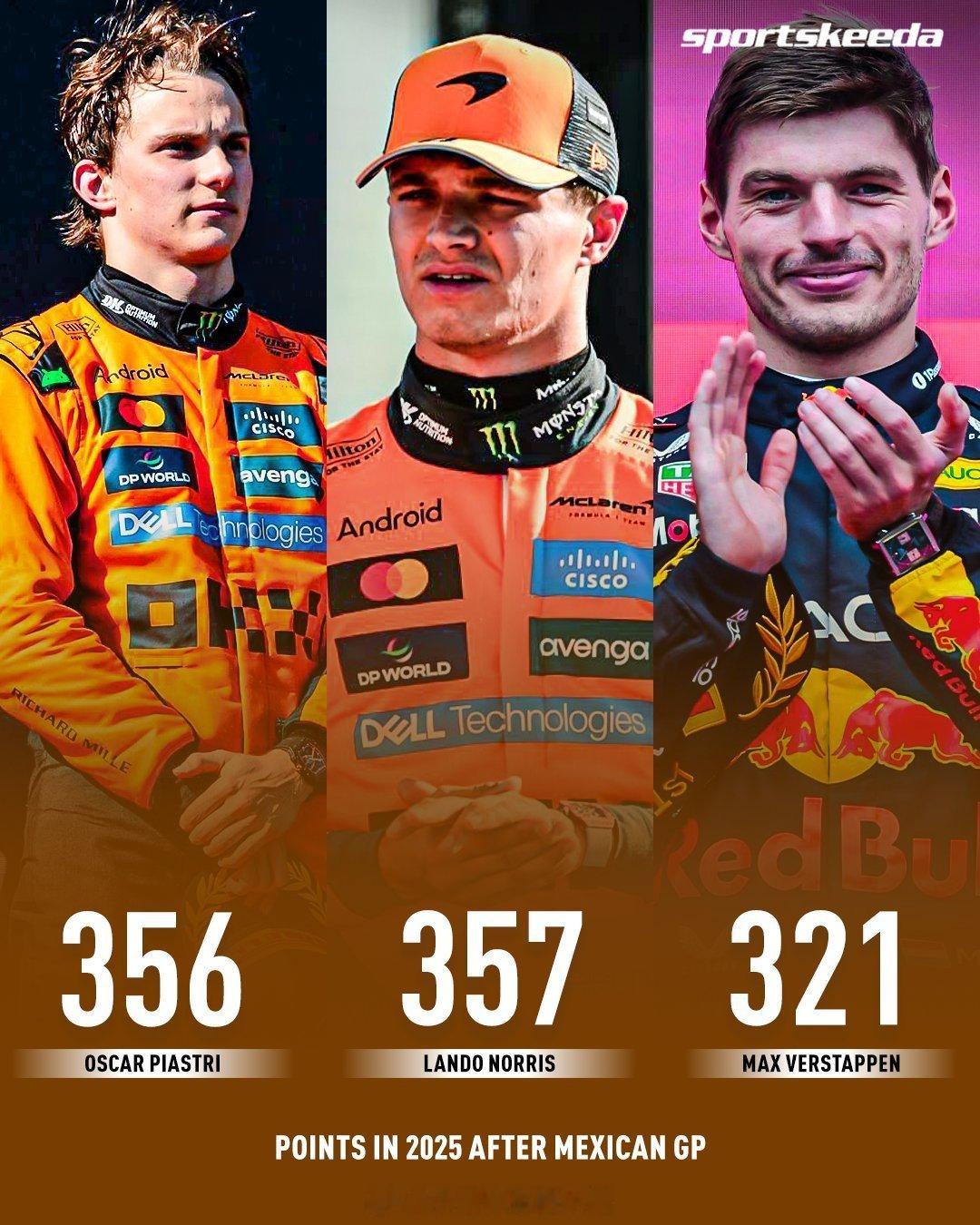 诺里斯夺墨西哥分站冠军后,总积分高出队友皮亚斯特里1分,重回积分榜首。