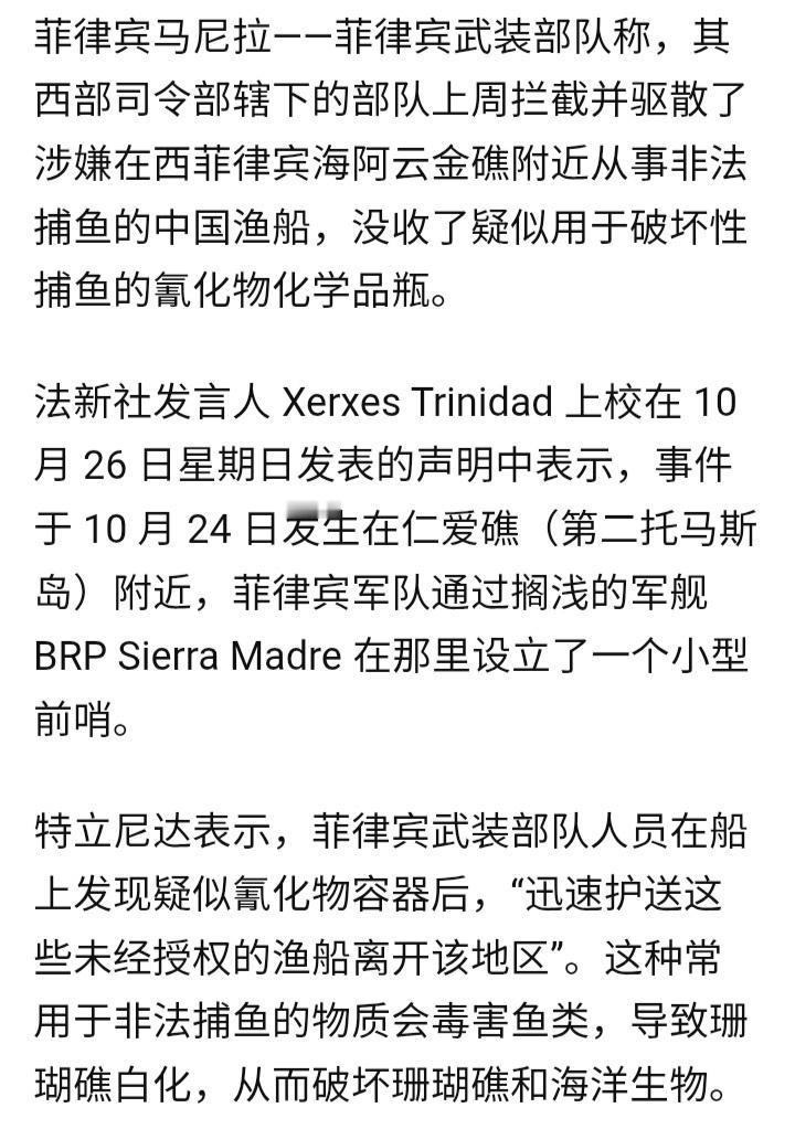 菲媒称,菲律宾武装部队西部司令部辖下的部队10月24日拦截并驱散了涉嫌在仁爱礁附近从事所谓“非法捕鱼”的中国渔船,没收了疑似用于破坏性捕鱼的氰化物化学品。