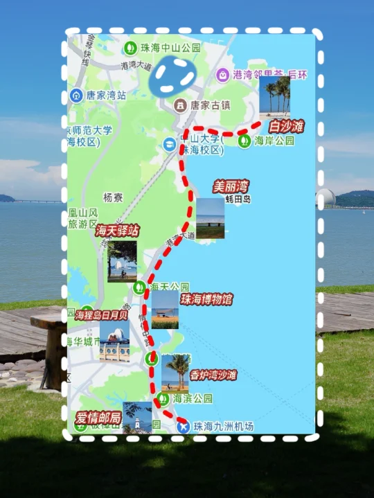 来了一趟珠海果然没让我失望 珠海真的太好拍了📷 这条半天能走完的免费拍照路线‼️ 攻略路线图放最后啦~请查收√️ 📸拍照打卡: P2:美丽湾公交站 P3:海天驿站 P4:野狸岛日月贝 P5:海天公园沙滩 P6:香炉湾沙滩 P7:海滨浴场 P8:爱情邮局 P9:白沙滩 🍽周边美食推荐:渔记茶餐厅、唐家餸、和记菜馆、唐家茶果店 ‼️游玩tips: 1.如果想拍到蓝色的海,一定要选个晴天,珠海的海太挑天气了 2.如果像我一个人出去旅行,建议带上三脚架,我自己用的是黑琵W28S,铝合金+碳纤维的材质,带出去很轻便,在轻便的基础上三根中轴也增加了稳定性,拍延时和长曝光画面稳的一批!模块化设计分为“主架+子架+云台”三个独立部分,可以自由组合变成自拍杆或者是超低位拍摄视角,云台自带手机支架,可以同时满足多机位拍摄,这对我来说太实用了,我买的是快拆式卡座,固定相机只需单手操作,告别以前那种繁琐的安装! 3.尽量选择公共交通出行,周边停车不方便 4.海边一定要注意防晒🌞