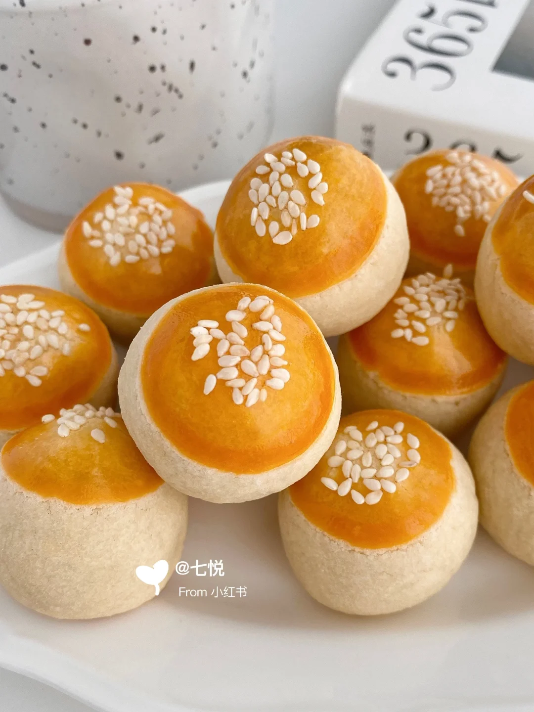 6️⃣顶部蘸蛋黄液,摆入烤盘,放白芝麻