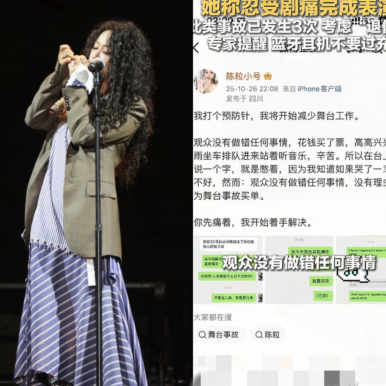 陈粒太让人泪目了! 不是因为陈粒的演唱会多成功, 而是她在舞台上发生意外时的反应,所有人都没发觉,只有她一个人知道,要不是事后她发文,我们根本不知道她的耳返在她的耳朵里发生爆炸,文中她说这是舞台事故,不应该让为他买单的粉丝来承受这个结果,如果他当时说了,那么这个演唱会的效果肯定就会不好,就会对不起粉丝所花的钱。