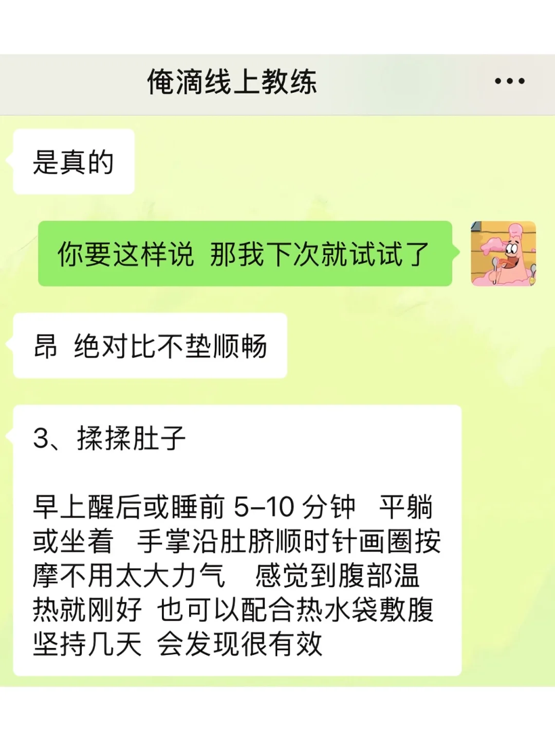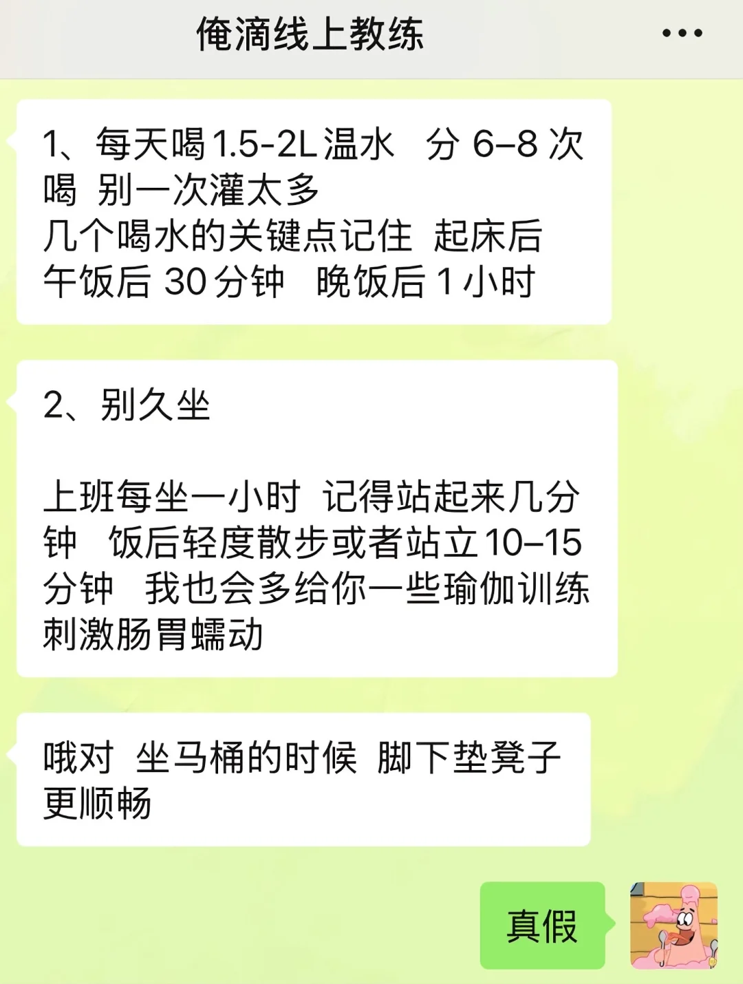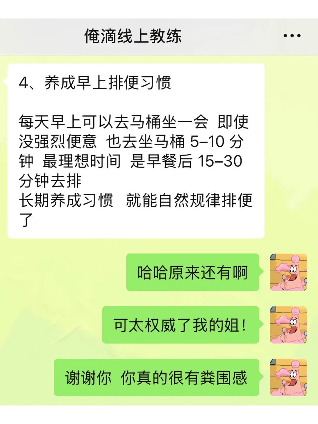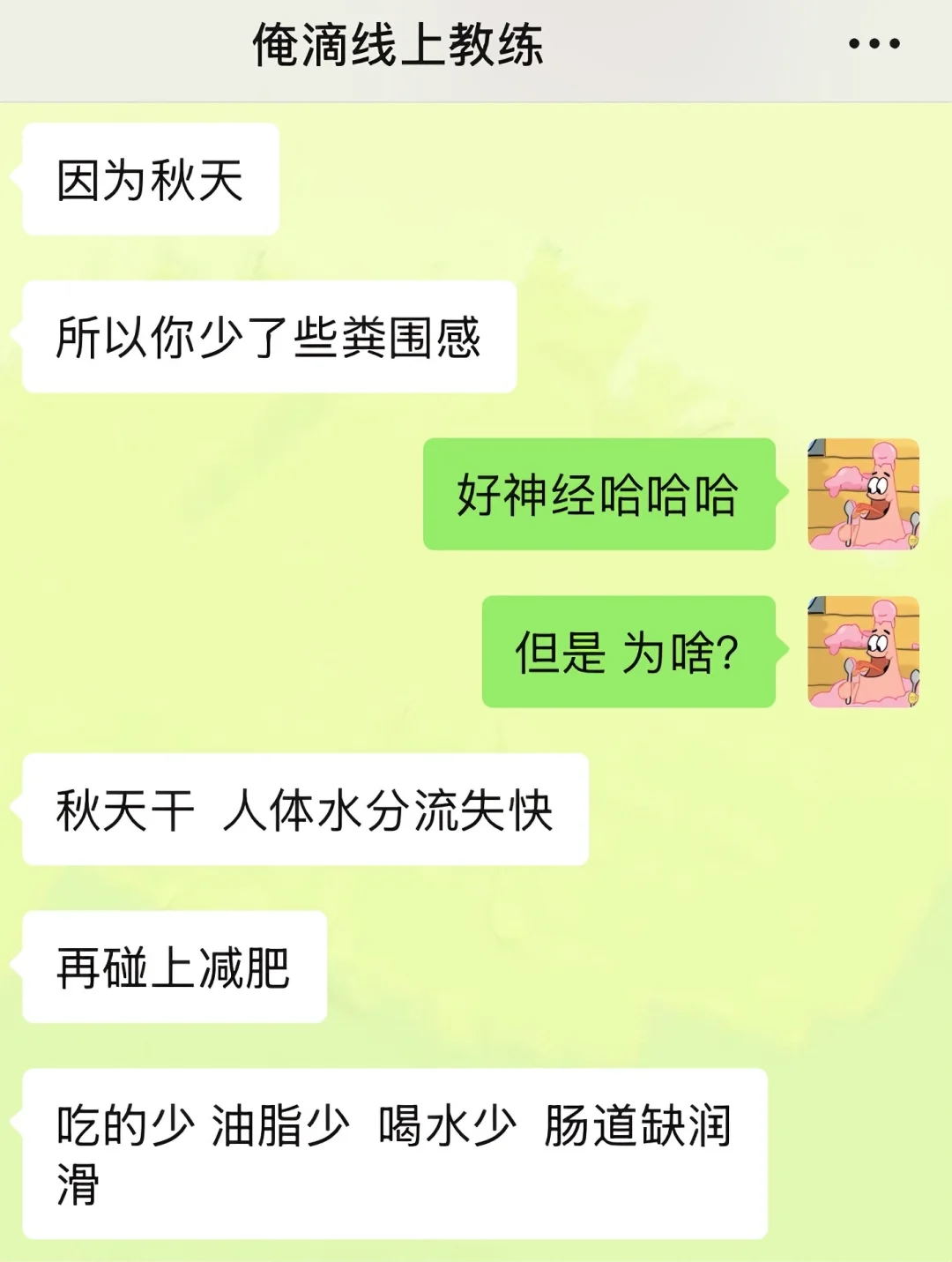 收到线上健身教练姐的消息,给我一愣 寻思这是咋了,谁又惹她了 结果她真一本正经给我分析起来了,还真别说,真从她那给我学到有用知识了 秋天和我一样,缺点粪围感的姐妹,都进来学知识点[doge] 教练姐给的方法真的有用,因为第二天我就顺利排便了[偷笑R]