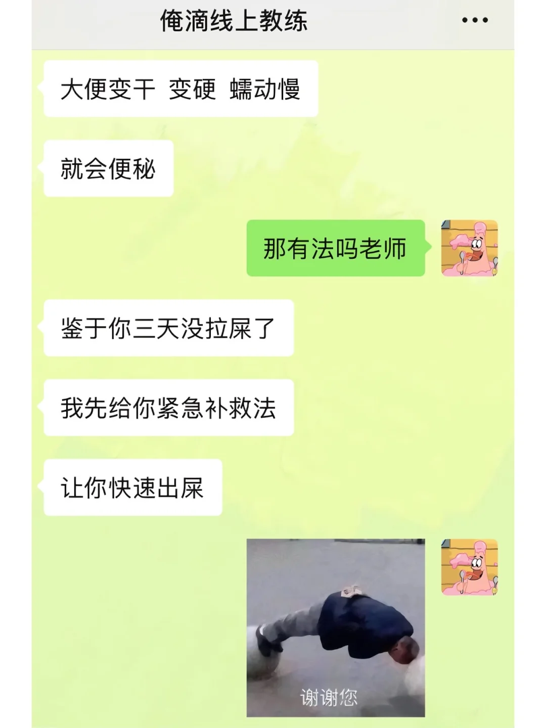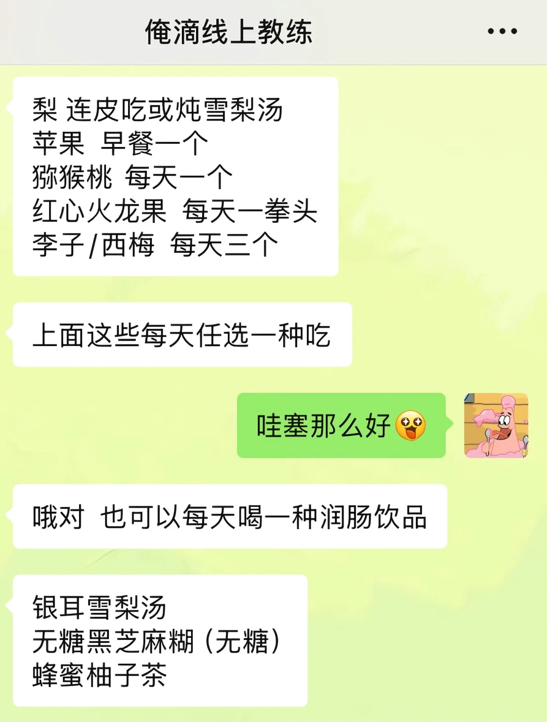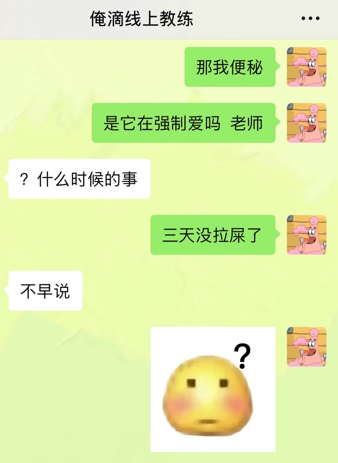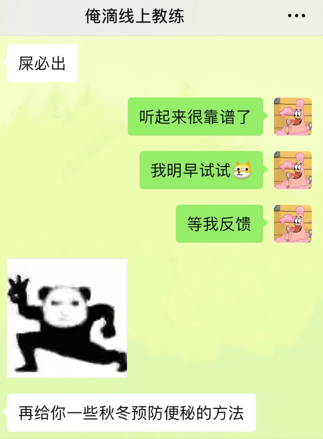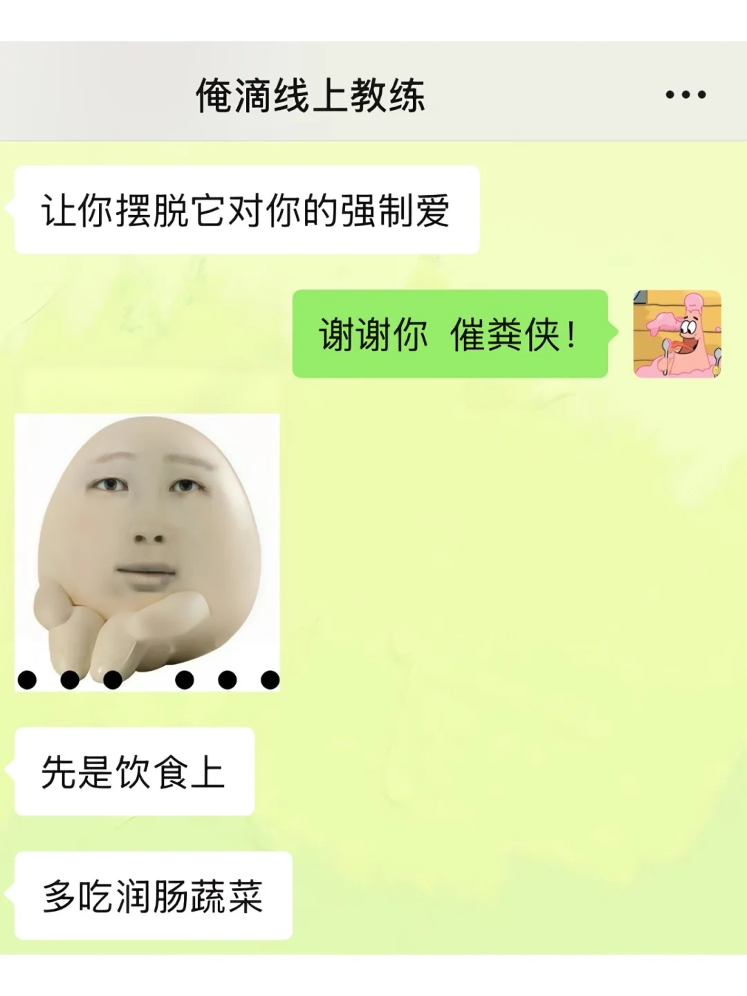 收到线上健身教练姐的消息,给我一愣 寻思这是咋了,谁又惹她了 结果她真一本正经给我分析起来了,还真别说,真从她那给我学到有用知识了 秋天和我一样,缺点粪围感的姐妹,都进来学知识点[doge] 教练姐给的方法真的有用,因为第二天我就顺利排便了[偷笑R]