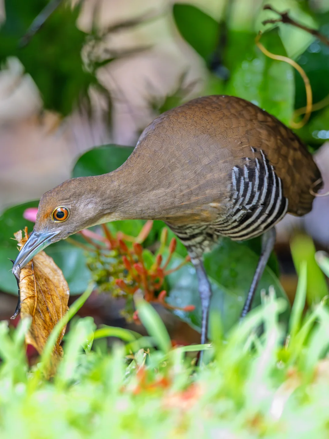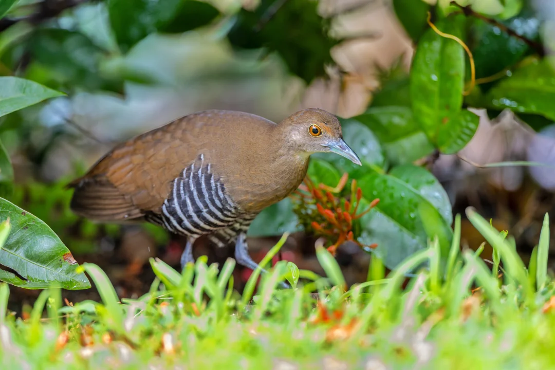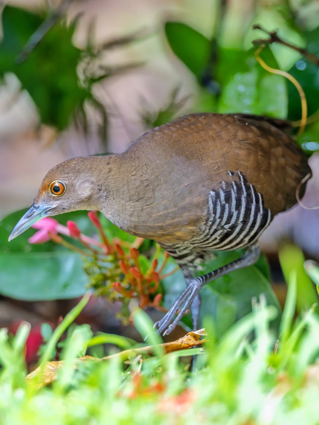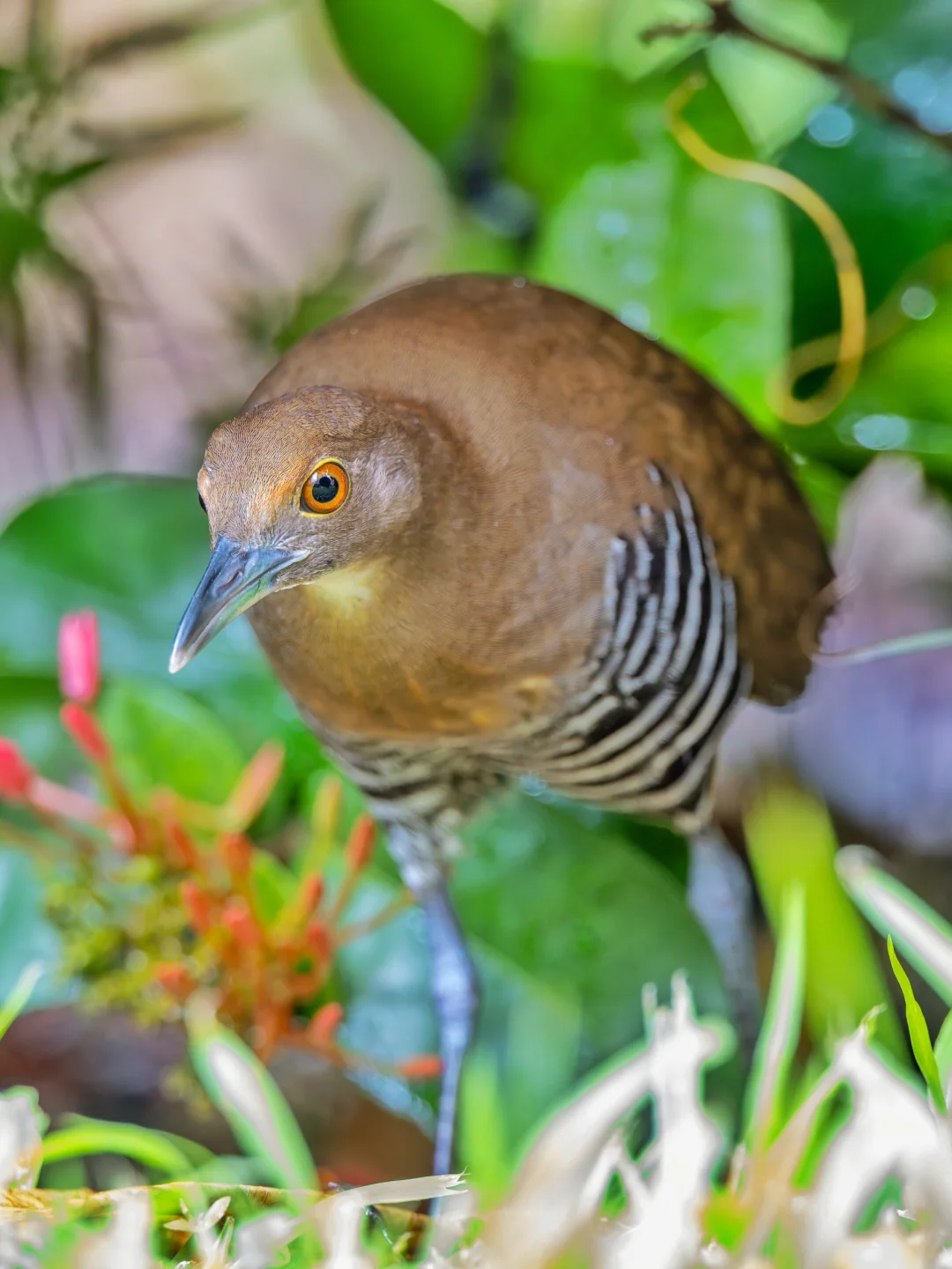 原创拍摄于2025.10 白喉斑秧鸡,Slaty-legged Crake,鹤形目秧鸡科斑秧鸡属。是在我国南部分布的一种小型秧鸡。名字可以看出,它喉咙略白,另外头胸橙色,腹部带黑白条纹,脚深铅灰色,都是它的特征。 白喉斑秧鸡其实在我国南方并不算特别罕见,只是非常担心,隐藏功力深厚,加上喜欢夜行,所以很难发现和拍到,就是野外能偶尔听见koko的叫声。 说到这里,真是不得不又双叒叕感叹,香港的神秘德福花园,这么小的闹市区小区的迷你花坛能每年都吸引超多好鸟前往,真是太神奇了!