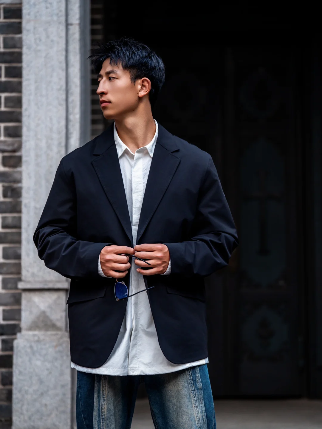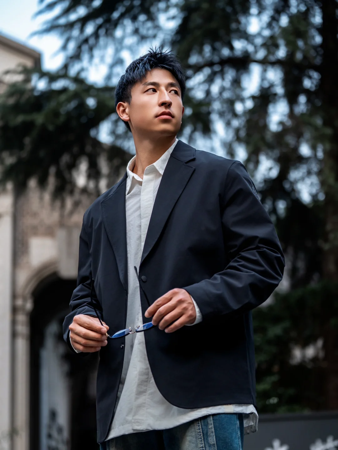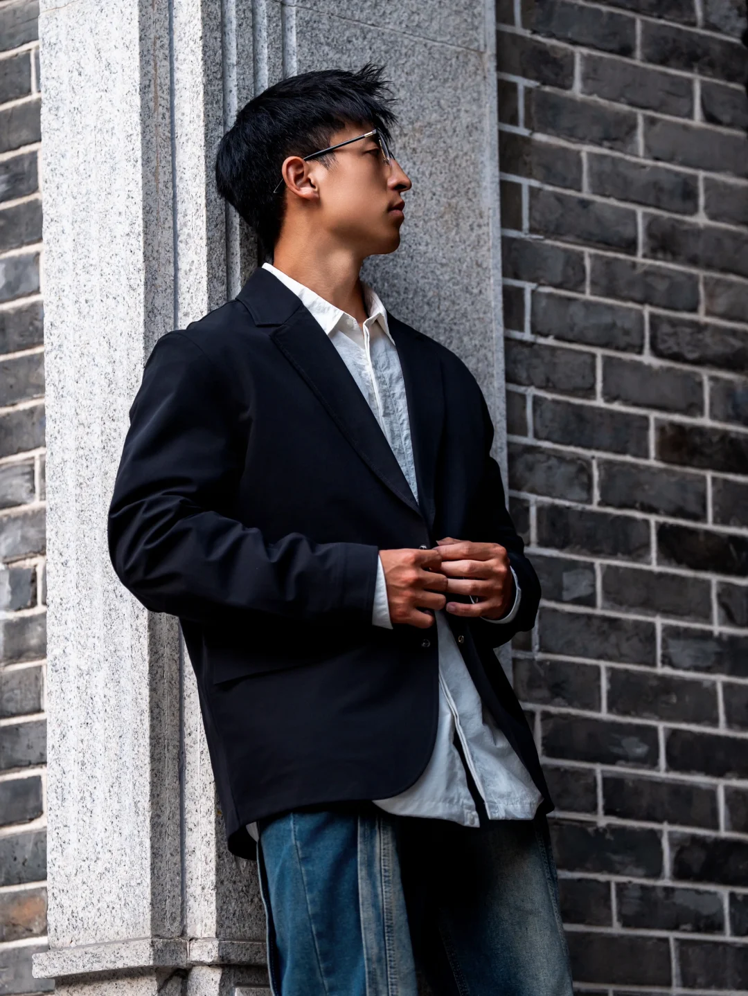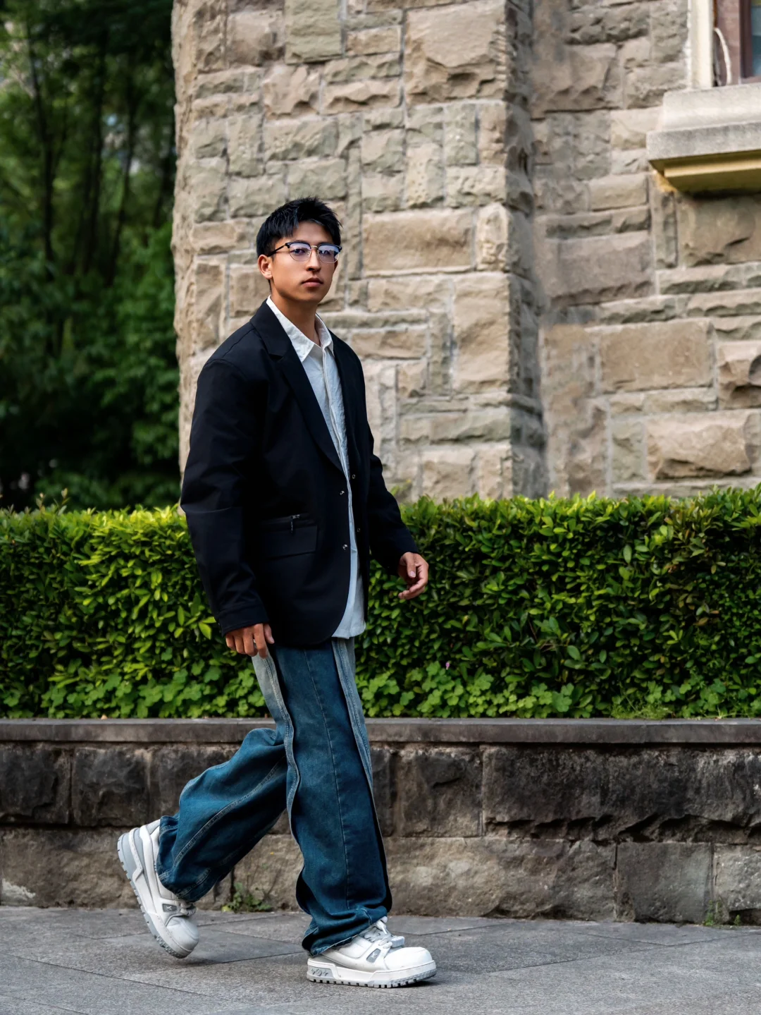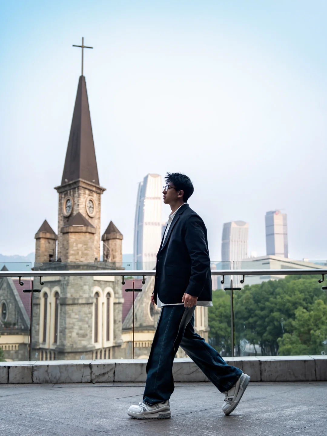 内搭纯色衬衫+牛仔裤,西装袖口随意卷起。福音堂前阶梯坐下,让阳光透过外套防水面料折射出光泽——这一程,你是街头信徒,也是潮流布道者。