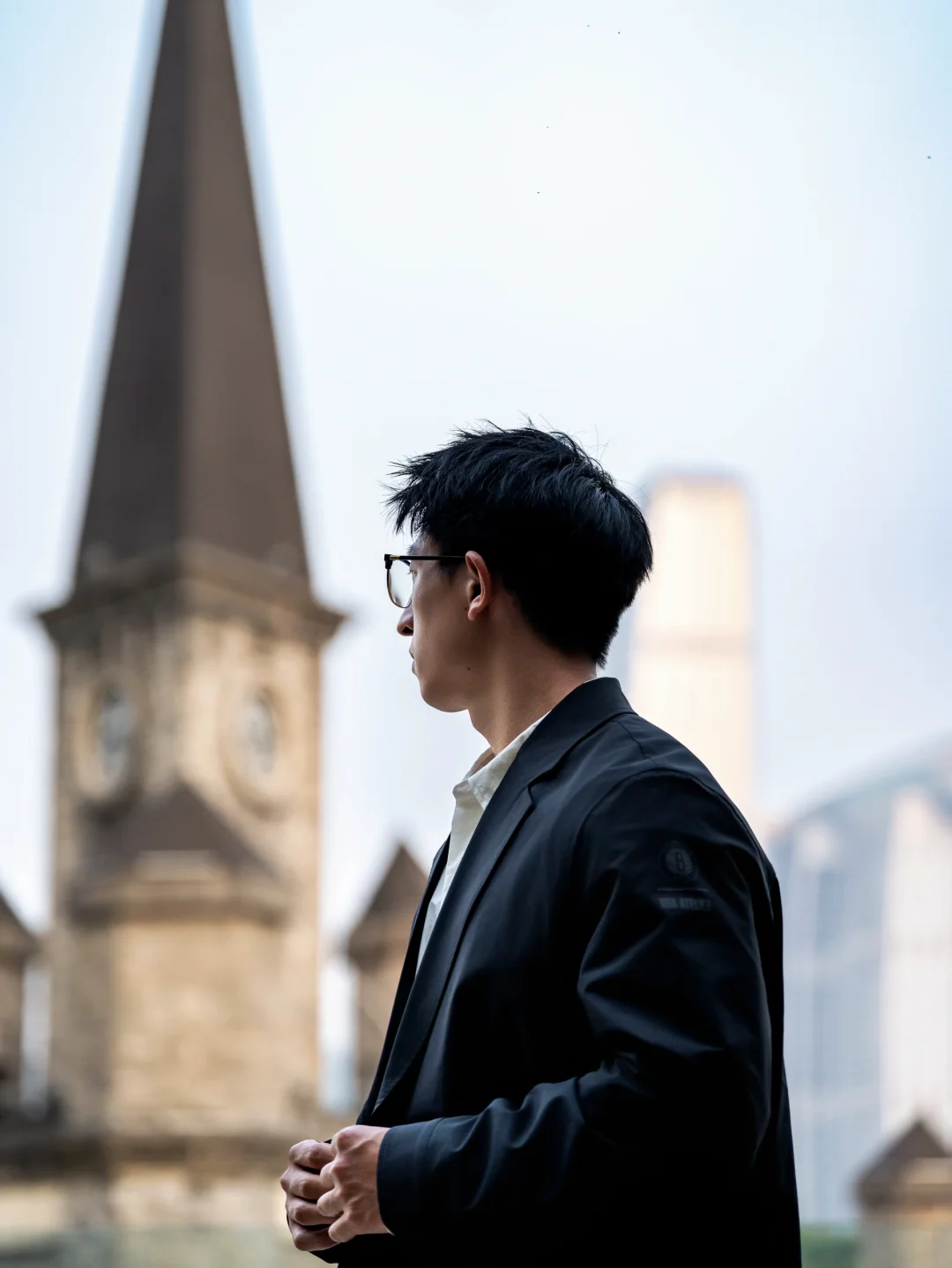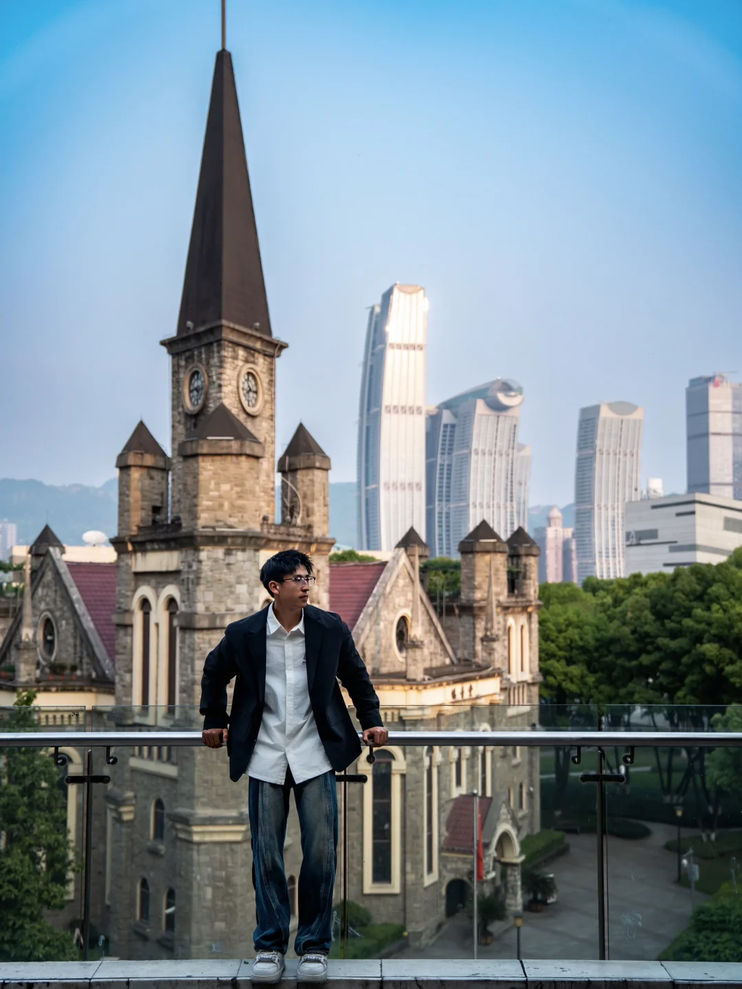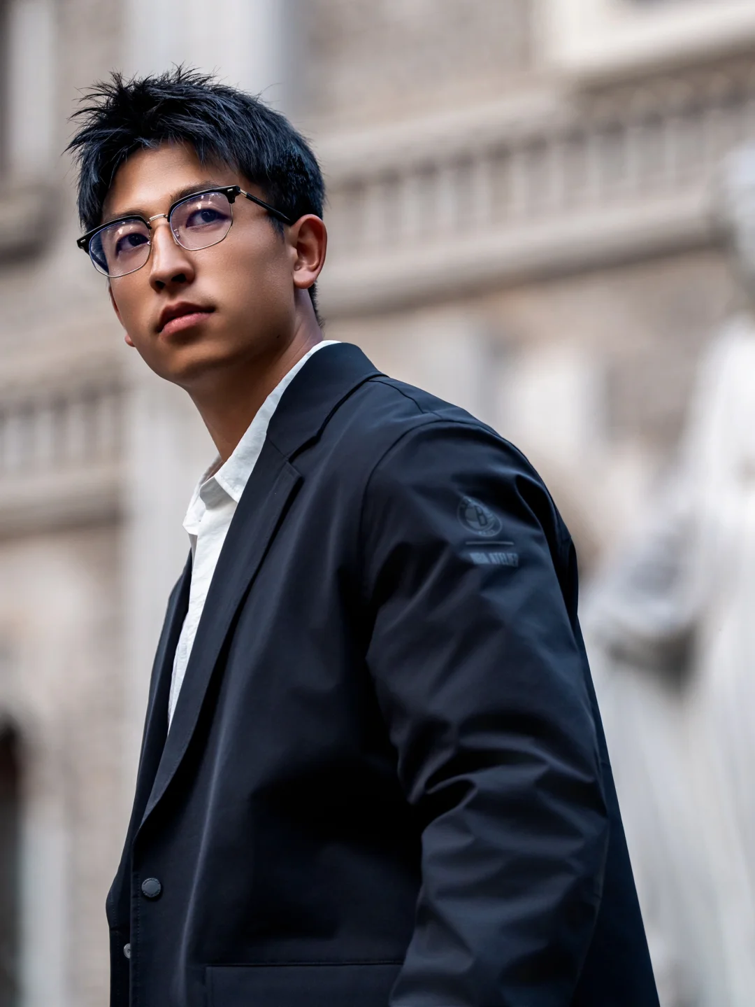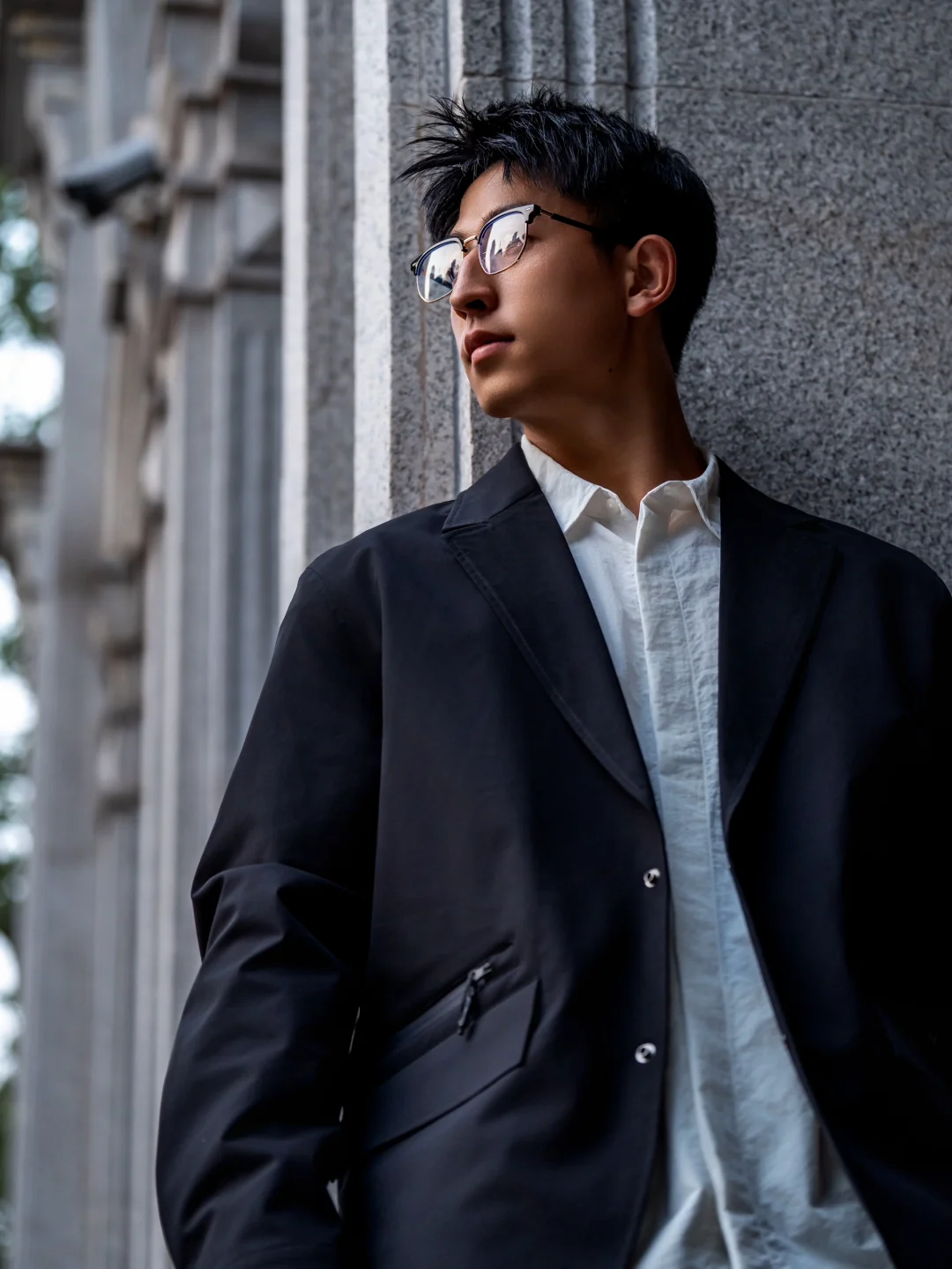 内搭纯色衬衫+牛仔裤,西装袖口随意卷起。福音堂前阶梯坐下,让阳光透过外套防水面料折射出光泽——这一程,你是街头信徒,也是潮流布道者。